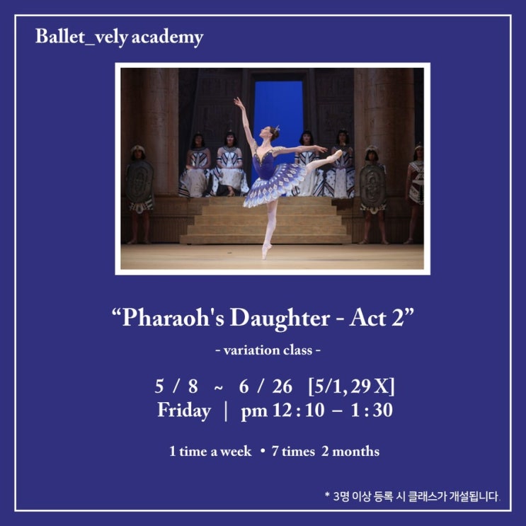 ‘파라오의 딸 - 2막 바리에이션‘ 매 주 금요일 pm 12:10 두 달간 7회 진행 (5/1, 29 휴강) • 쿠폰 클래스 / 두 달 예약제 입니다. • 쿠폰은 월 초에 7회가 차감 됩니다. (별도의 어플 예약 없이 수강) • 수강권의 기간은 2주 이상 남아있어야 등록 가능합니다. (2주 - 4회까지 차감 가능, 4주 - 7회 차감 ) • 결석 시 두 달간 2회에 한하여 쿠폰 2회 반환됩니다. (당일 결석 통보는 노쇼 처리되며, 최소 1일 전 결석에 대해 연락 주셔야 가능합니다.) • 바 워크 후 바리에이션 클래스 진행됩니다. • 우지연 선생님 클래스 • 토슈즈 착용 가능 상담 및 등록 문의 카카오톡 채널 "발레블리" 네이버 톡톡 문의 010........ <img src="https://blogthumb.pstatic.net/MjAyNjA0MTVfMjgx/MDAxNzc2MjQxOTMwMTQy.LXChmneJOM-mR7WAO202g2kvqUq5XZirLgo8BVvL_u0g.5FvrZI9d0C-xuLKS1vUhGT5EI--TfKMnFoXiGYJLKBIg.JPEG/IMG%A3%DF5265.JPG?type=s3" />