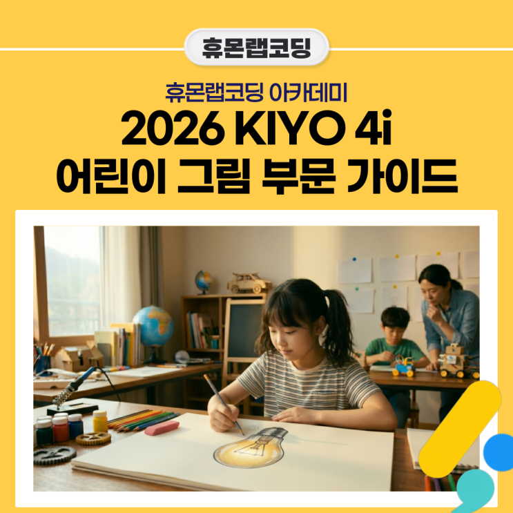 안녕하세요! 스스로 생각하는 힘을 키우는 휴몬랩코딩 아카데미 입니다. 곧 진행 예정인 키요대회(KIYO 4i)에 대한 가이드를 전달해드릴 예정입니다. 그 중에서 청소년들의 재능과 창의성을 표현하는 '어린이 그림' 부문에 대해 설명드리겠습니다. KIYO 4i 대회 설명 KIYO대회는 세계청소년올림피아드(Korea International Youth Olympiad)4i를 의미하며, 전 세계 청소년들이 창의력, 발명, 과학 기술 분야 역량을 육성하는 국제대회입니다. 창의성, The BBl, 어린이 그림, 토론 총 4개의 부문으로 나눠져 있습니다. KIYO 4i 어린이 그림 부문 설명 대회 주제 어린이들이 일상생활에서 느끼는 불편함을 관찰하고, 이를 해결하고 싶은 마....... <img src="https://blogthumb.pstatic.net/MjAyNjA0MjdfMjkz/MDAxNzc3MjU0NzM5NDI0.5Apd8qbcG0p2L0MTDfjDlmFusFz6ZIjNLoXPt4seR_0g.H0cZ5sHHKEaGJLmxwwKQBz5oFzUdDrpYEmlKYD9pHfwg.PNG/%BA%ED%B7%CE%B1%D7-2-009.png?type=s3" />