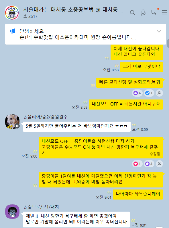 안녕하세요, 손대장입니다. 오늘은 4월의 마지막 날, 내일이면 5월이네요. 많은 생각이 교차하는 5월입니다. 벌써 올 한해의 절반이 지나가고 있구나. 하는 생각 한스푼, 그리고 한해가 무슨 대수랴, 큰 그림을 보아야지 하는 생각도 한스푼, 그래서말인데. 내가 올 상반기에는 무슨 발전이 있었지? 하는 마음 속 생각도 한 스푼... 우리 베이비들은 초딩이들은 어린이날 기다리며 마냥 신날테구요 중딩이들은 내신 막바지라 시원섭섭 후련찝찝 여러 마음이 들겠지만 일단 한달 빡세게 달렸으니 좀 쉬고 싶다는 생각을 하겠지요? 중간고사가 끝나고 많은 베이비들이 잠깐 숨고르기에 돌입할텐데. 제가 오늘도 오픈채팅에서 이런 이야기를 했답니....... <img src="https://blogthumb.pstatic.net/MjAyNjA0MzBfMTk0/MDAxNzc3NTI3MDIzMDE3.FU_vgrwSpI_AkqxD7fGeu-Rpp43XJmXaJa5W7CEINNEg.jo5_p-G8aAkMJdCUkkZ6dRQcecmtZNPtkvLPTlnVI0Yg.PNG/image.png?type=s3" />