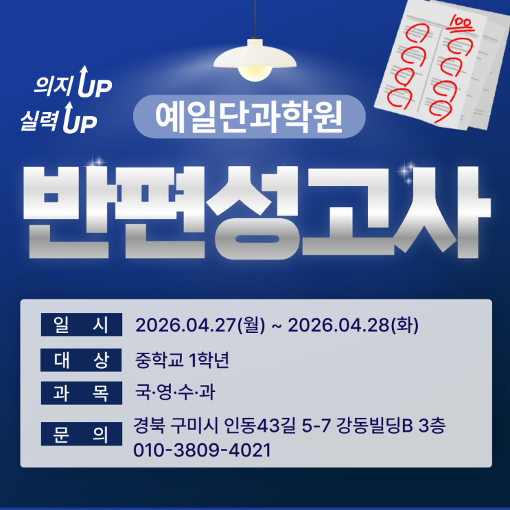 안녕하세요. 예일단과학원입니다. 이번 게시글에서는 반편성고사에 대해 안내드리려고 합니다. 이번 반편성고사는 대상 : 중학교 1학년 일시 : 4월 27일(월) ~ 28일(화) 과목 : 국·영·수·과 시험을 치르고자 합니다. 중학교 1학년 학생들은 자유학기제로 인해 1학기에는 학교 시험이 없지만, 저희 학원에서는 시험 환경에 미리 익숙해지고 자신의 실력을 객관적으로 점검할 수 있도록 정기적으로 자체 시험을 진행하고 있는데요‼️ 반편성고사 후에는 성적표를 보내드릴 예정이니 참고 부탁드립니다☺️ 문의 사항이 있으신 경우 010-3809-4021으로 전화, 문자 주시면 더욱 자세한 상담 도와드리겠습니다 #YALE #YEI #입시학원 #구미입....... <img src="https://blogthumb.pstatic.net/MjAyNjA0MjJfNjAg/MDAxNzc2ODUzMDk1ODUw.v9h_iqCQS2Cyk2dAPPYQPG6URTMnspyC8Kh_aPfXjgMg.JEfssrs_C7-xSa6qbHvXO_5G3g06Z2i7YmYGsBqGxbIg.PNG/%C1%A6%B8%F1%C0%BB_%C0%D4%B7%C2%C7%D8%C1%D6%BC%BC%BF%E4.-_%BA%B9%BB%E7%BA%BB.png?type=s3" />