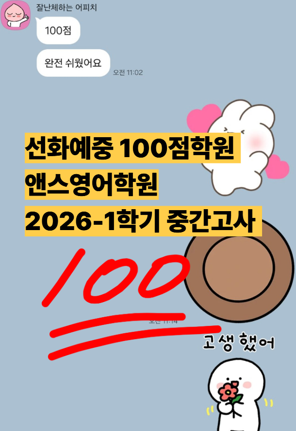 선화예중영어학원 앤스영어학원 선화예중2학년, 2026년 1학기 중간고사 100점!!