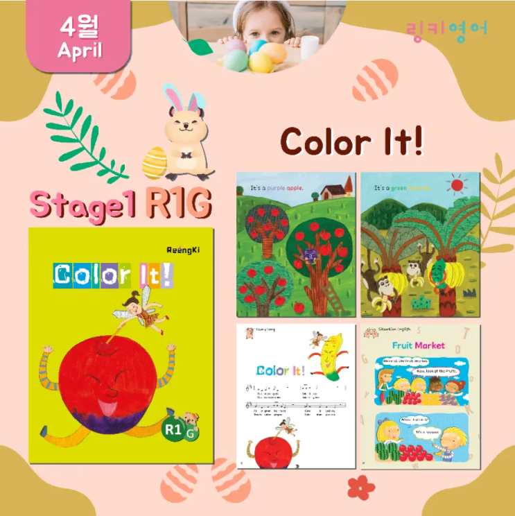 안녕하세요!^^ 링키영어연지래미안점 Jessa Teacher 입니다. 봄 꽃을 느끼며 4월 교재 소개 가볼까요? Stage 1-1 이번 4월달은 아이들에게 아주 친숙한 주제이죠? '과일', '색깔' 에 대하여 배워 봅니다. Purple, Red, Yellow, Green, etc.... 등 색깔을 나타내는 표현 ! Banana, Apple, Watermelon, Grapes etc ... 등 과일을 표한 하는 어휘!! "Color it ." "It's a/an ." "What color is it?" "It'....... <img src="https://blogthumb.pstatic.net/MjAyNjA0MDhfMjY0/MDAxNzc1NjU0ODkwNjkw.Zsy_rvz6UQUMa7dFkI3sy0wteDNrFmDpU3KXfBxr8_gg.7LbPDKTbNcTEdKro3uMEYTVs7ZJF1pEzsBoRwx0kGpsg.PNG/900%A3%DF%A3%DBColor_It%A3%A1%A3%DD_SNS%BF%EB_%BE%C8%B3%BB%B9%AE%A3%DF1.png?type=s3" />