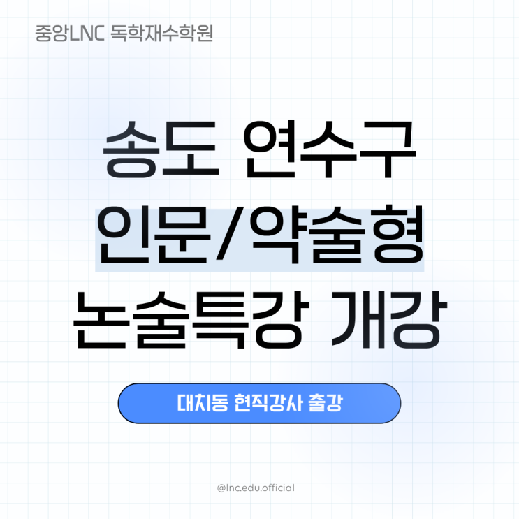 안녕하세요 송도 연수구 독재학원 중앙LNC입니다 저희 중앙LNC에서는 대치동 현직 논술강사를 초빙해 퀄리티 높은 첨삭을 받아보실 수 있도록 매년 논술특강을 진행하고 있는데요 지난 불수능을 겪으면서, 인천 송도와 연수구 지역에서도 논술을 준비하려는 학생들이 늘어나 약술형과 인문논술 2가지 과정을 올해도 어김없이 개강했습니다 수강생 모집 기간과 개강 일정 등 자세한 커리큘럼은 아래에서 참고해주세요! ∨ ∨ [개강일정] 약술형 4월 27일 인문논술 6월 13일 이번 특강은 대치동에서 실제 강의를 진행 중이신 손호연 강사님과 김영재 강사님이 직접 수업을 진행해주십니다 현장에서 수업을 이어가고 있는 강사분들로 실제....... <img src="https://blogthumb.pstatic.net/MjAyNjA0MTdfMzIg/MDAxNzc2NDIyNDYxMDMy.lRLoj_qBoB4UTd_vl_bE2JhuNZx4imnST0JZMTkf0d0g.L_okARMlSeTYdIdGbiEv_Cw0NI0ahTnB4423jC2Pwygg.PNG/%C1%DF%BE%D3LNC_%C7%D0%BF%F8_%281%29.png?type=s3" />