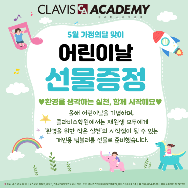안녕하세요, 클라비스학원입니다. 가정의 달 5월, 아이들을 위한 소중한 날인 어린이날을 맞이하여 항상 클라비스학원에 보내주시는 따뜻한 신뢰에 감사드립니다. 5월에는 아래 두 가지 주요 사항을 안내드리오니 학원 생활에 참고 부탁드립니다. 올해 어린이날을 기념하며, 클라비스학원에서는 재원생 모두에게 ‘환경을 위한 작은 실천’의 시작점이 될 수 있는 개인용 텀블러를 선물로 준비했습니다. 학생들이 단순히 선물을 받는 것에서 끝나는 것이 아니라, 이를 직접 활용하며 생활 속 환경 보호 실천에 자연스럽게 참여할 수 있도록 하고자 합니다. 이번 변화는 단순히 환경 규제를 위한 조치가 아닌, 아이들이 생활 속 작은 습관을 통해....... <img src="https://blogthumb.pstatic.net/MjAyNjA0MjNfMTkz/MDAxNzc2OTE4Mzc0MTY3.JMA0vOFq8GC5CTd0RhApHb5zCx5ie1rp9vTXDgoIVzUg.dfXzW61jUPVGQN6-iHC8_SLOifs3QrWVTZmx5QOPlqcg.PNG/2025-%BE%EE%B8%B0%C0%CC%B3%AF-%BC%B1%B9%B0%C0%CC%BA%A5%C6%AE-002.png?type=s3" />