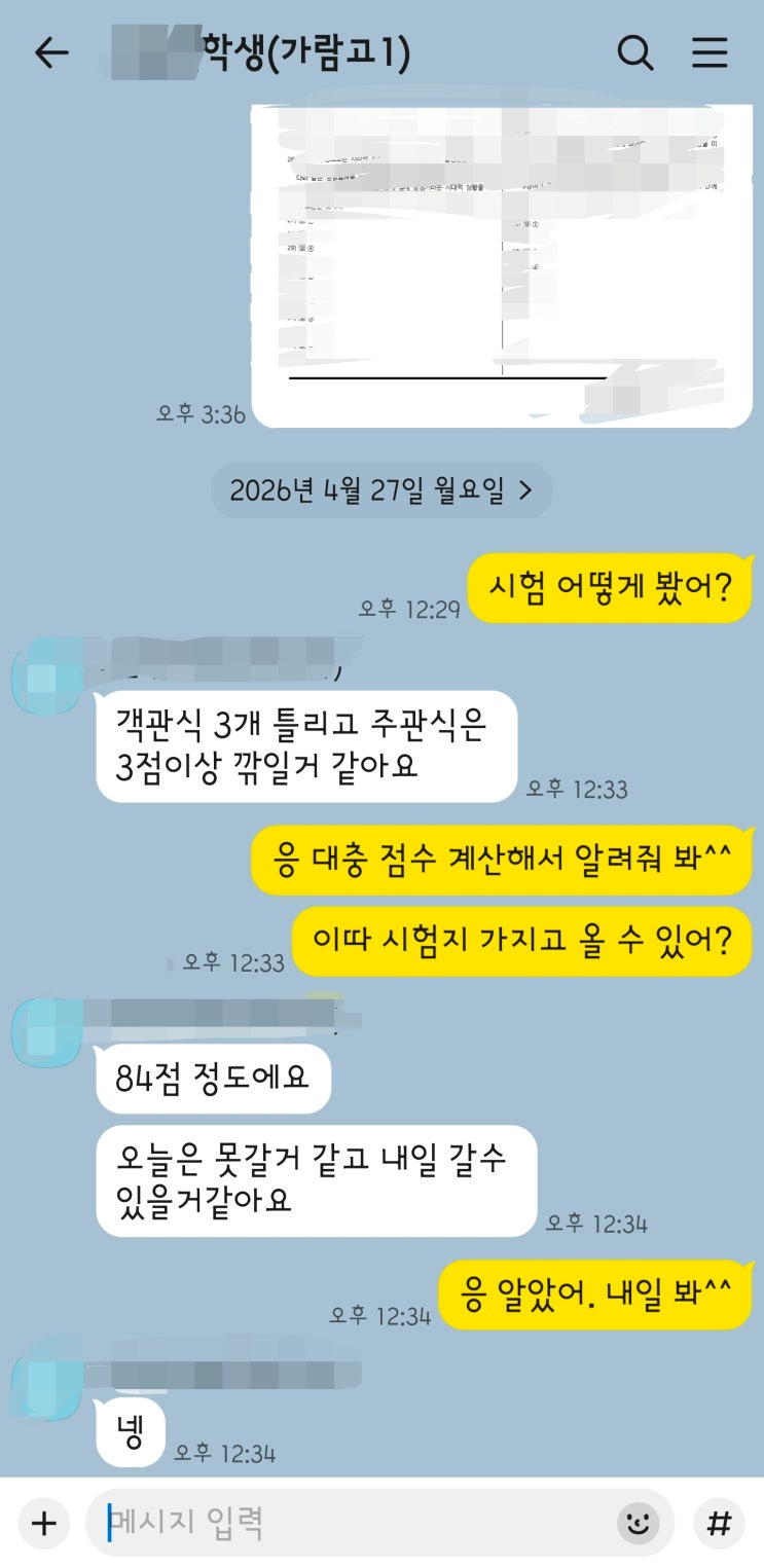 아직 서술형 때문에 정확한 점수는 알 수 없지만, 객관식은 3개 틀렸고, 주관식은 많이 깎일 것을 각오하고 가채점한 것입니다. 최저 84점 하지만 실제로는 85점 이상은 나올 것 같습니다. 이 학생도 서술형을 채점해야겠지만 80점 초반 점수입니다. 그래도 실전 모의고사 보면서 연습할 때보다는 점수가 올라서 다행입니다. 제가 주변에 가람고를 비롯해서 광남고, 건대부고, 자양고, 대원고, 대원여고 등등 여러 학교 학생들으 모두 가르치기 때문에 아이들 공부하는 모습만 봐도 대충 몇 점 정도 받아올지 예상이 가능합니다. 이번 시험 대비를 하면서도 가람고 1학년 학생들에게 너희들이 아무리 애를 써도 이번 시험에서 80점을 넘기기 어렵....... <img src="https://blogthumb.pstatic.net/MjAyNjA0MjdfMTAx/MDAxNzc3Mjk3MTkzMTYx.kVRj1qvqxwdRZ84570_ErQA38EhLKD3QNY5a5lo3qLUg.yal0Fm8ntaQp5avod9ncZs4Rwn9yTbaOumPGIZHWZNwg.JPEG/KakaoTalk_20260427_222358189.jpg?type=s3" />