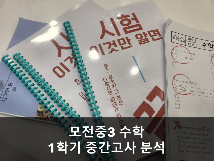 모전중3 수학 1학기 중간고사 분석 -교과서 중심 출제와 서술형 40점의 비중- 안녕하세요, 정관 생각의숲 수학국어학원입니다. 어제 치러진 모전중학교 3학년 1학기 수학 시험 분석 내용을 공유합니다. 모전중 3학년 1학기 중간고사 수학 시험은 지학사 교과서를 기반으로 기본기를 확인하면서도, 높은 서술형 배점을 통해 변별력을 확보한 것이 특징입니다. 1. 시험 범위 및 문항 구성 범위 : 제곱근과 실수부터 인수분해까지 구성 : 객관식 16문항(60점) + 서술형 6문항(40점) 특징 : 서술형 한 문제당 배점이 6점에서 8점으로 매우 높아, 풀이 과정에서의 실수가 등급을 결정짓는 핵심 변수가 되었습니다. 2. 난이도 및 출제 경향....... <img src="https://blogthumb.pstatic.net/MjAyNjA0MjRfMjUw/MDAxNzc3MDAwNzkwODcy.Hq5YL6npq9AWqSjbH_lbNciQFsvx5sDiYkdXB_kS1Lgg._1LMuH0C7pq4IIKhRqTSiHN_FDfBW9oJRYZOnpaIa50g.JPEG/KakaoTalk_20260424_121642291.jpg?type=s3" />