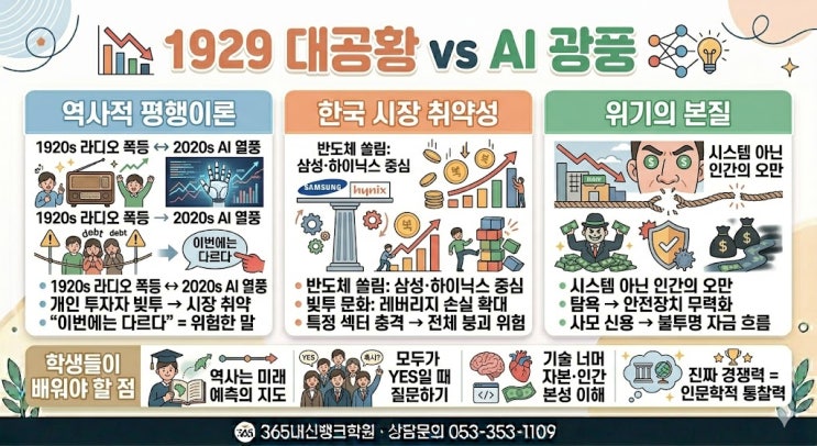 #2027대입 #경제인사이트 #AI반도체 #주식시장 #1929대폭락 #대구학원 #365내신뱅크학원 안녕하세요, 대구 지역 학생들의 완벽한 내신 관리와 정교한 입시 전략을 책임지는 365내신뱅크학원입니다. 오늘 소개해 드릴 내용은 뉴욕타임스 저널리스트 앤드루 로스 소킨의 신작 '1929'에 담긴 시장 분석입니다. 급변하는 경제 상황 속에서 우리 학생들이 단순히 기술의 발전만을 보는 것이 아니라, 그 이면에 흐르는 역사의 반복과 경제적 원리를 통찰하는 안목을 기르길 바라는 마음으로 준비했습니다. 1. 1920년대 라디오와 2020년대 AI의 평행이론 폭등의 메커니즘은 100년 전이나 지금이나 소름 끼칠 정도로 비슷합니다. 192....... <img src="https://blogthumb.pstatic.net/MjAyNjA0MjVfNDAg/MDAxNzc3MDg1NDk3MTQx.xGH3BZffj756nL_ag2T9iQ1MKzWCKvOjNhMgqzQpT5wg.E6L1gbPH7Edz1z6auV0wNCSf58JBPL1IgcKFTlDh4Fkg.JPEG/%B4%EB%B0%F8%C8%B2.jpg?type=s3" />