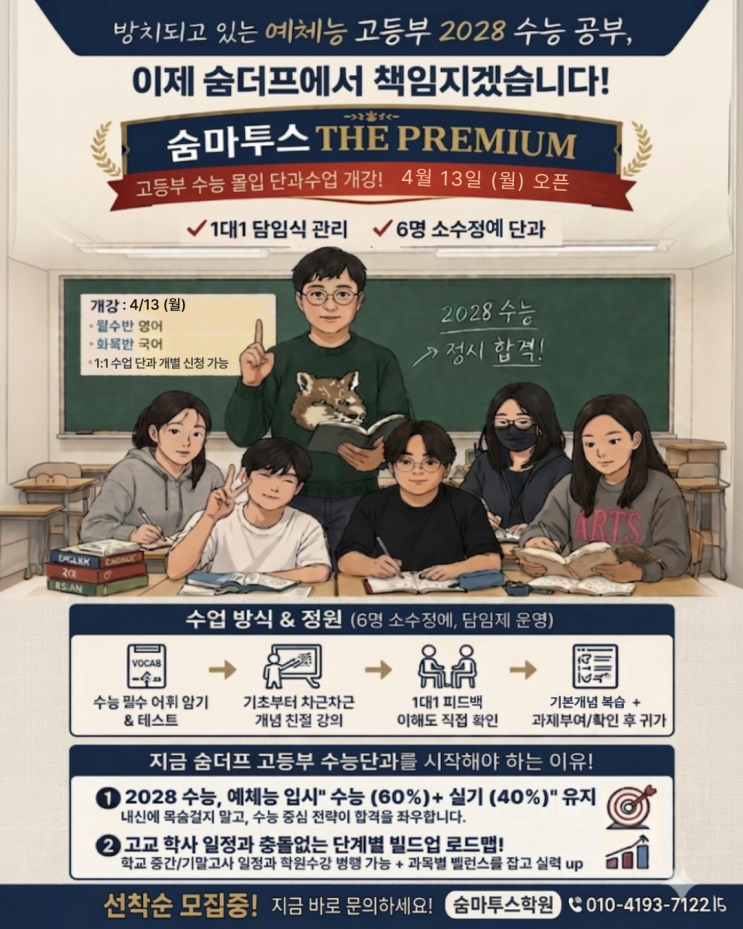 방치되고 있는 예체능 고등부 2028 수능 공부 이제 숨마투스 the premium(숨더프)에서 책임지겠습니다! 안녕하세요, 예체능 입시의 NO.1 숨마투스 THE PREMIUM(숨더프)입니다. 이번주부터 4월말~5월초에 치러지는 1학기 중간고사 대비로 우리 고등부 학생들 바빠지기 시작했을겁니다. 내신 준비해야 하는데 무슨 뜬금 없는 수능 이야기냐 하실겁니다^^ 그런데 여러분! 혹시 그거 아시나요? 예체능 계열 명문대는 정원의 대부분을 정시로 선발한다는 거!!!! 수시 선발 인원이 정시보다 많은 곳은 홍대가 거의 유일한데 홍대의 경우 내신 성적도 중요하지만 미술활동 스펙이 없으면 내신이 아무리 좋아도 그림의 떡이라는 것을 ㅜㅜㅜㅜ....... <img src="https://blogthumb.pstatic.net/MjAyNjA0MDdfODEg/MDAxNzc1NTYwMDM4OTEx.1rUPFVMcKfynLB3qHpmUmw9RlvciRNjhCx3uW8OPd1Ig.l_yLBvQMxyDoc1V42-_GMMxjPwVwzgsE7lKN97qzwocg.PNG/%B0%ED%B5%EE%BA%CE_%B4%DC%B0%FA.png?type=s3" />