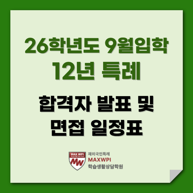 인녕하세요. 재외국민특례 맥스WPI학원의 맥스비입니다! 26학년도 9월 입학 12년 특례의 합격자 발표와 면접 일정을 공유드립니다. ^^ 12년 특례에 지원한 모든 학생들에게 좋은 소식이 전해지길 맥스비가 응원하겠습니다. ▲ 5월 5월 1일 : 서울대 면접 대상자 발표 5월 8일 : 서울대 면접 (온라인) / 항공대 1차모집 최종합격자 발표 5월 15일 : 한동대 면접대상자 발표 5월 21일 : 서울대 예비합격자 발표 / 성균관대 스포츠과학과 면접 대상자 발표 5월 22일 : 이화여대 최종합격자 발표 5월 28일 : 성균관대 스포츠과학과 면접 (대면) 5월 29일 : 한동대 면접 (온라인) ▲ 6월~7월 6월 5일 : 연세대, 고려대, 한양대 최종 합격자 발표 6월 1....... <img src="https://blogthumb.pstatic.net/MjAyNjA0MTJfODUg/MDAxNzc1OTUyNDQ1NzUx.J25ydg24Yd75_0Jfy2_iumSji7Rjd2AMwU9-Z3yYxusg.dlI4A-dM7JqUNJ6gReZnbM-O3efXiX0r0kga7OkwTH4g.PNG/%3F%A0%9C%EB%AA%A9%EC%9D%84_%3F%9E%85%3F%A0%A5%3F%95%B4%EC%A3%BC%EC%84%B8%3F%9A%94._%2819%29.png?type=s3" />