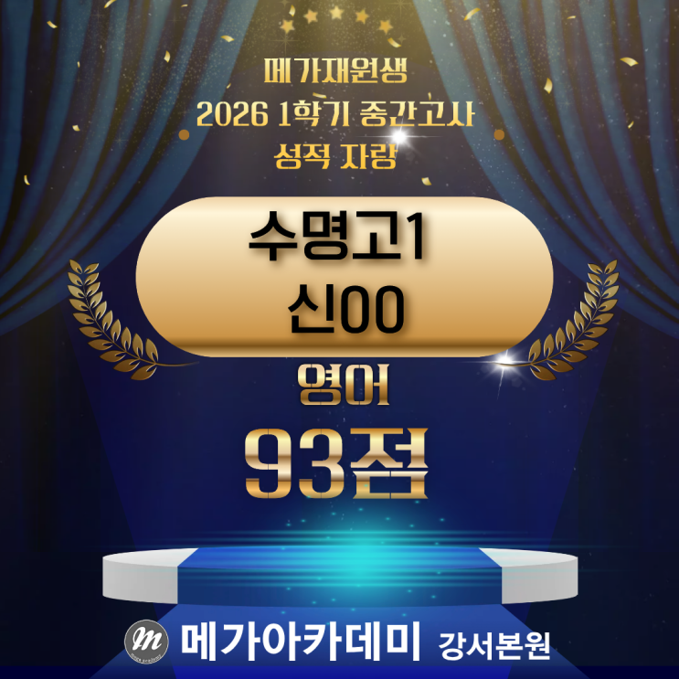 신OO 학생, 정말 너무 잘했어요! 안녕하세요, 메가아카데미 강서본원입니다! 오늘은 우리 학원에서 정말 자랑스러운 소식을 전해드리려고 해요. 이번 중간고사에서 수명고등학교 1학년 신OO 학생이 영어 과목에서 93점이라는 훌륭한 성적을 받았습니다! 고등학교 1학년, 처음 맞이하는 고등 내신 시험에서 이런 점수를 받았다는 건 정말 대단한 일이에요. 선생님들도 너무 기쁘고 뿌듯합니다! Story · 노력의 과정 93점 뒤에 숨겨진 이야기 고등학교 영어는 중학교와는 차원이 다릅니다. 지문의 길이와 난이도가 급격히 올라가고, 어휘·문법·독해 모든 영역을 고르게 잡아야 비로소 90점대 점수가 가능해집니다. 신OO 학생은....... <img src="https://blogthumb.pstatic.net/MjAyNjA0MjNfNjIg/MDAxNzc2OTI2MjEwMjEx.NGbCjG-_CUpBCIR881kSRf_QH2qU38TgL7g2hNl-r7cg.sB5ZpMDdqxZ7-mrVURBFqxSJY-4FMYpBhNCv7Jsv6eQg.PNG/%BC%BA%C0%FB%BB%F3%BD%C2_%B4%F6%BF%F8%BF%A9%B0%ED-_%BA%B9%BB%E7%BA%BB_%281%29.png?type=s3" />