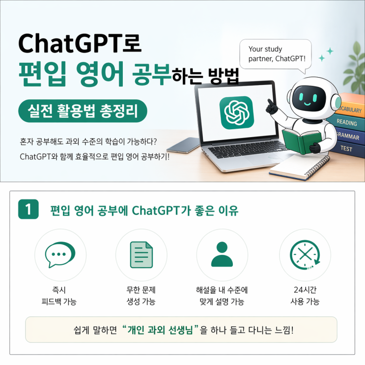 안녕하세요 오늘은 요즘 많은 분들이 궁금해하는 **“ChatGPT로 편입 영어 공부하는 방법”**에 대해 정리해보려고 합니다. 편입 영어는 단순 암기가 아니라 독해력 + 어휘력 + 해석력 + 문제풀이 감각까지 모두 필요한 시험인데요. 이걸 혼자 공부하면서 채점, 해설, 피드백까지 받기 어려운 구조라 많이들 막히는 부분이 생깁니다. 그런데 이걸 ChatGPT 하나로 상당 부분 해결할 수 있습니다. ✅ 1. 편입 영어 공부에 ChatGPT가 좋은 이유 ✔ 즉시 피드백 가능 ✔ 무한 문제 생성 가능 ✔ 해설을 “내 수준에 맞게” 설명 가능 ✔ 24시간 사용 가능 즉, 쉽게 말하면 “개인 과외 선생님”을 하나 들고 다니는 느낌입니다. ✍️....... <img src="https://blogthumb.pstatic.net/MjAyNjA0MjFfMjAz/MDAxNzc2NzUwNDA0MDcw.DrAup_ujlR1HO1VjQQucEs_7eE2iyA-7CAA1lAlbNjIg.j0DASbv114t_2-zwDPDjeA-kBS9DYQgw3XTwLBW6258g.PNG/1.png?type=s3" />