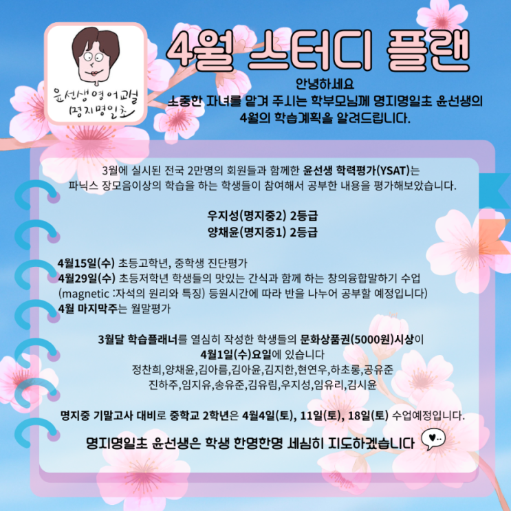 명지영어학원 명지명일초 윤선생의 4월의 스터디플랜