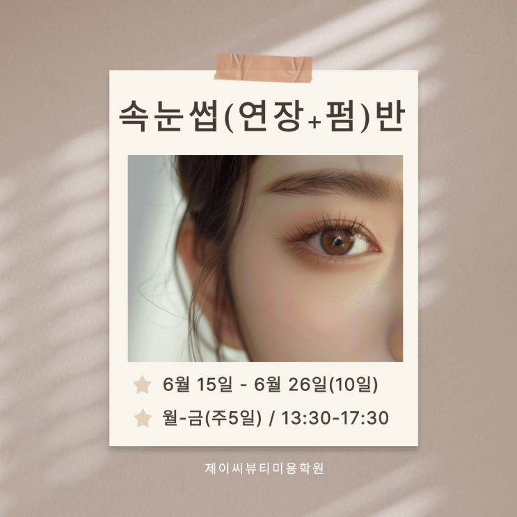 안녕하세요 :) 제이씨뷰티미용학원입니다✨ 날씨가 따뜻해지면서 메이크업도 점점 가벼워지고 있는데요, 그래서 인지 요즘은 화려한 메이크업보다 자연스럽게 또렷한 눈매를 만들어주는 속눈썹 시술에 대한 관심이 정말 많이 높아진 것 같아요 속눈썹 연장과 펌은 작은 변화 같지만 실제로는 전체 인상을 훨씬 또렷하고 분위기 있게 만들어주기 때문에 한 번 배우면 꾸준히 활용할 수 있는 정말 매력적인 기술입니다. 기술 하나 제대로 배우면 확실한 경쟁력이 됩니다 속눈썹 시술은 단순히 붙이는 기술이라고 생각하시는 분들도 많지만, 실제로는 고객의 눈매와 이미지에 맞게 디자인을 하고, 컬과 길이를 조절하며 전체적인 분위기를....... <img src="https://blogthumb.pstatic.net/MjAyNjA0MjBfMTY0/MDAxNzc2NjUzNzMxMzQ5.gE2jBBMim85HIuIRKD3yjfoRcJzQ5WeeCDJa-y3pvr4g.wm557kvZj5JS1sH4ltHl60XGDQzmQWJZgdq-MTxYA-8g.PNG/%C1%A6%B8%F1%C0%BB-%C0%D4%B7%C2%C7%D8%C1%D6%BC%BC%BF%E4_-008.png?type=s3" />