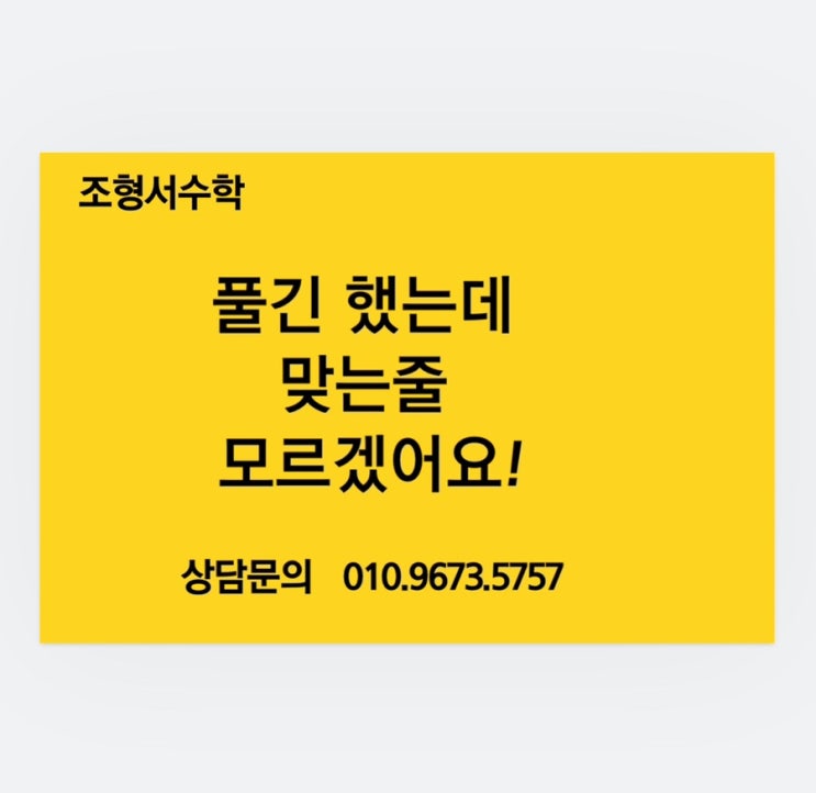 “풀긴 했는데… 맞는지 모르겠어요”라고 말하던 학생에게. . 안녕하세요. 조형서수학교습소입니다. 오늘은 교습소에서 학생들과 상담하면서 자주 나오는 이야기들을 조금 솔직하게 풀어보려 합니다. 같은 고민을 하고 있는 학생들과 학부모님들께 작은 방향이 되었으면 좋겠습니다. “풀긴 했는데… 맞는지 모르겠어요” 수업이 끝나고 한 학생이 이렇게 말했습니다. “선생님, 풀긴 했는데… 이게 제대로 푼 건지 모르겠어요.” 이 질문, 저는 굉장히 좋아합니다. 왜냐하면 이건 단순한 질문이 아니라 **‘생각하면서 공부하고 있다는 증거’**이기 때문입니다. 그래서 저는 항상 이렇게 말해줍니다. “그럴 때는 그냥 넘어가지 말고 ‘....... <img src="https://blogthumb.pstatic.net/MjAyNjA0MjZfMTkw/MDAxNzc3MTcwNjgyMzIw.ILv8zQML2Nex0KHOz8MZeesjswrDUk3-N72Q-IPu0sEg.hbbGpExQEfRMiu5wrsGidaiAS9DQMPRJhV8U0cAUUuEg.JPEG/output%A3%DF2482207686.jpg?type=s3" />
