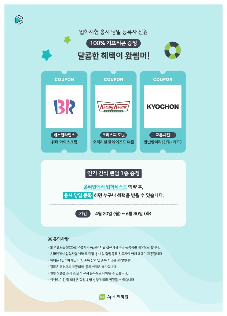 안녕하세요. 에이프릴어학원 탕정국제 캠퍼스 입니다 :) 여름 학기를 맞이하여 당일 등록 이벤트를 진행합니다! 온라인 입학테스트 예약 후 테스트를 응시하고, 당일 여름 학기 정규 과정을 등록한 학부모님들께 지급되는 이벤트 입니다. 아이들의 첫 시작, 즐거운 기억으로 남을 수 있도록 준비했습니다 ♥ 지금 바로 입학 테스트 예약하시고 달콤한 혜택도 꼭 받아가세요! ☎️ 041-427-1234 <img src="https://blogthumb.pstatic.net/MjAyNjA0MjBfMTI1/MDAxNzc2Njc5NzQwNjgw.alfryjRPT69VAjQUkVUPuDThd0M8gbDLeMhC6AxymI8g.ejqaP8JSyMADPiaJuk1l8IIbHDzgjW-R5bJwjHGV2jEg.JPEG/260417_AP_%BF%A9%B8%A7%C7%D0%B1%E2_%C0%D4%C7%D0%BD%C3%C7%E8_%B4%E7%C0%CF%B5%EE%B7%CF_%C0%CC%BA%A5%C6%AE-%C6%F7%BD%BA%C5%CD_%C0%CE%BC%E2%BF%EB.jpg?type=s3" />
