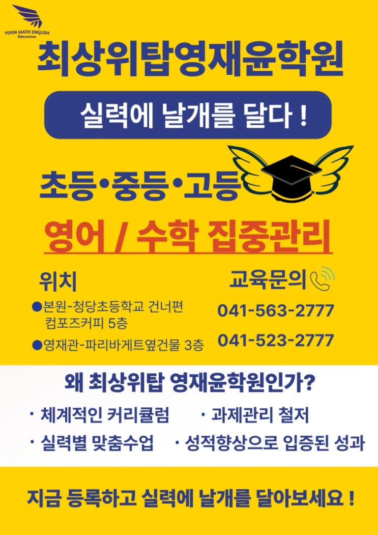 안녕하세요~ 우리 학원에는 학생들을 위한 자습실이 있습니다. 원장님이 공부를 위한 지원은 절대 아끼지 않기 때문에!! 학원에서 가장 넓은 공간을 차지하고 있지요 ㅎㅎㅎ 그럼에도 만족을 모르는 우리 원장님...... 이번에 독서실 책상을 새로 장만하여 리뉴얼 오픈 합니다^^ 한번만 보면 반해서 공부를 하지 않을 수가 없는 환경입니다. 맛보기로 보여 드릴께요~~~ 책상도 100cm 로 넓어서 교과서와 참고서를 맘껏 펼쳐 놓을 수 있고, 조명도 필요에 따라서 여러 가지로 조절이 가능하답니다^^ 자습실을 이용하고 싶은 학원생들은 빠르게 얘기해 주세요~ 지정석으로 운영되며, 선착순 배정입니다. 010-2142-4218 <img src="https://blogthumb.pstatic.net/MjAyNjA0MjFfMjQx/MDAxNzc2NzU2ODAyODg0.Zyf9RAiRiE5bZrnuc-CmxL4DS8N4Jtgew88G2_nB8ggg.m1YGYCaZQue4Wg-NItFF5ppiT0Gy4nOHBVP_rhZuDUwg.JPEG/KakaoTalk_20260421_162339703_05.jpg?type=s3" />