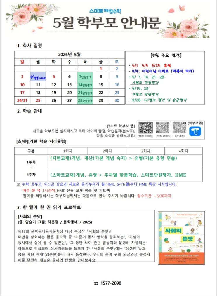 안녕하세요! 불당 행복한 해법 스마트해법수학입니다. 싱그러운 5월을 맞아 가정에 행복이 가득하시기를 기원합니다. 5월은 어린이날과 어버이날 등 가족의 달로 다채로운 행사와 풍성한 시간이 가득합니다. 학원에서도 아이들이 즐겁고 보람찬 시간을 보낼 수 있도록 다양한 행사와 학습 프로그램을 준비했습니다. 또한, 아이들의 학습에 도움이 될 만한 중요한 학습 정보도 함께 공유해 드리고자 합니다. *이번 가정통신문 내용을 찬찬히 읽어보시고, 궁금한 점은 언제든지 문의해 주시기 바랍니다. 5월 학사 일정 안내 5월 주요 일정 및 휴원 안내 5/1 (금):근로자의 날 (휴원) 5/4 (월):어린이날 이벤트 (떡볶이 파티) 5/5 (화):어린이....... <img src="https://blogthumb.pstatic.net/MjAyNjA0MjFfMjM3/MDAxNzc2NzQwNzQxMjMw.Ndgwr2o4N7uNXchHi_foPV2Kq3hcn2TCnpUfRoBNZ1cg.Wx2lDJLwgF6ujsyOiNTTtOYfL9W90FI3E0Kfb9196yMg.JPEG/900_1776739676106.jpg?type=s3" />