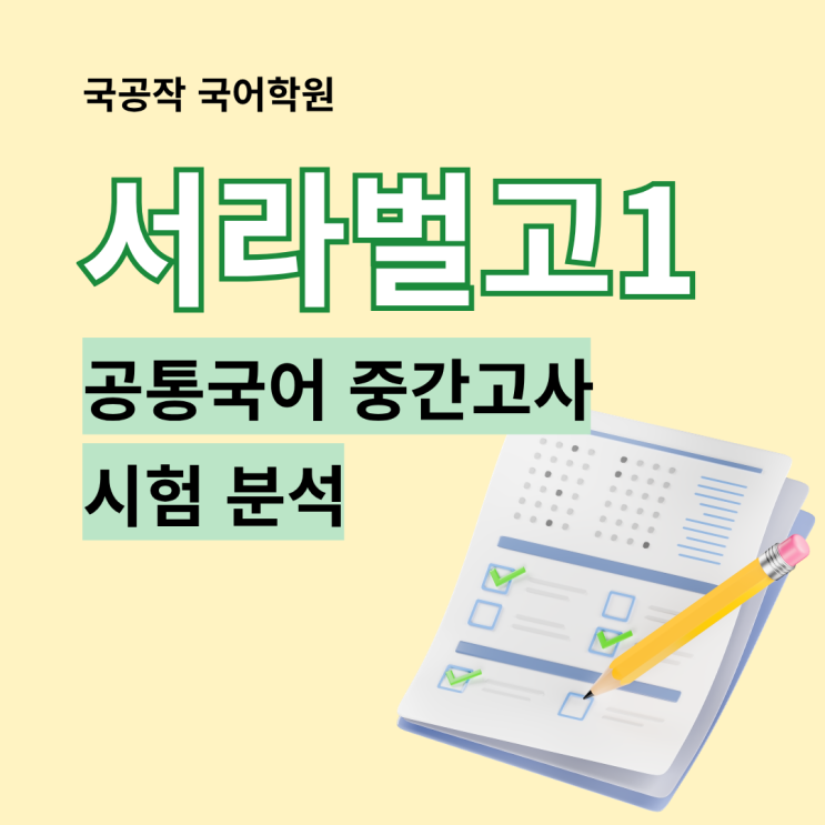 안녕하세요, 국공작 국어학원입니다. 고등학교 입학 후 치른 서라벌고에서의 첫 국어 시험, 모두 고생 많았습니다. 이번 1학년 중간고사는 작년보다 난이도가 상향 조정되어 당황한 학생들이 많았을 텐데요. 기말고사 역전을 위해 이번 시험의 핵심 포인트를 정밀 분석해 드립니다. 1. 중간고사 시험 범위 이번 시험은 문학 작품의 깊이 있는 이해와 문법의 정확한 원리를 묻는 단원들로 구성되었습니다. 문학: <배를 매며>, <봄봄>, <기적>, <풀 비린내에 대하여> 문법: 3-1. 올바른 발음과 표기 2. 난이도 및 예상 등급컷 전체 난이도: 약간 어려움 평가: 단순히 교과서 자습서 내용을 암기하는 수준을 넘어섰습니다. ....... <img src="https://blogthumb.pstatic.net/MjAyNjA0MjVfNzQg/MDAxNzc3MDkwMzY3ODM2.0VRkP3ygzd30kuPhqAEmG4tl-r74Mx1Hl4qNJc8q7vQg.c_O7Dm6bEfA_VK7XdcXjBFIsaXne_aaU2BkJXz5bjDYg.PNG/%B1%B9%B0%F8%C0%DB_%B1%B9%BE%EE%C7%D0%BF%F8.png?type=s3" />