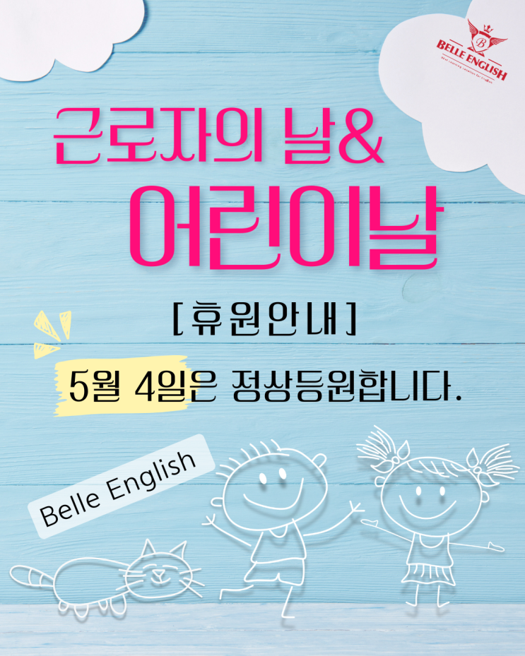 안녕하세요! 영어 배우기 가장 좋은 곳 BEst Learning Location for English 벨 영어입니다. 노란 바람결에 온 거리가 파스텔인 요즘 입니다. 꽃놀이도 끝나고 녹음이 짙어지기 전 우리 중등친구들은 1학기 중간고사가 한창 입니다. 이번 주 시험을 마무리하면 바로 5월의 시작입니다. 5월만큼 풍성한 달이 또 있을까 싶습니다. 이름은 다 다르지만 서로에 대한 위로,배려, 사랑,고마움,경탄처럼 초긍적적인 단어들이 가득한 한달인 듯 합니다. 올해에 법정 공휴일로 지정된 근로자의 날과 징검다리를 건너 5일 어린이날에는 휴원합니다. 그리고, 벨영어에서는 5월 4일에 특별수업을 합니다. 몇달 전부터 수시로 물어보는 친구들이 있지만 대답은....... <img src="https://blogthumb.pstatic.net/MjAyNjA0MjhfMjU3/MDAxNzc3Mzg4MTI3NTA3.jH5EX9EZO5AVWRxfzL-i8VnukwJm-3TeD5pKvmM9vXYg.0kyUntuUDXBWyRCAwzRT9Y8Zdk9gDbdJIbxHDCIvcOsg.PNG/2026%B3%E2%BE%EE%B8%B0%C0%CC%B3%AF%C8%DE%BF%F8.png?type=s3" />