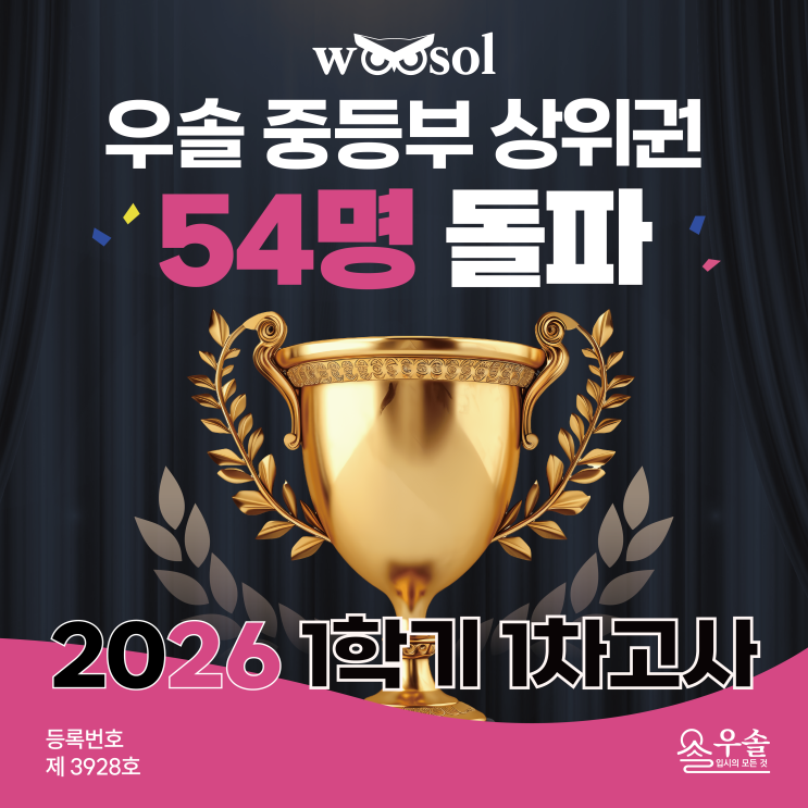2026학년도 1학기 1차 중간고사가 모두 끝났습니다. 한 학기의 출발을 알리는 중요한 시험이었던 만큼, 겨울방학 동안 쌓아온 아이들의 노력과 학부모님들의 기대도 컸을 거라 생각합니다. 혹시 지금, 생각보다 성적이 나오진 않아 걱정되시나요? 다가올 2차고사는 어떻게 준비해야 할지 고민되시나요? 이런 고민을 하고 계신다면, 삼계동 중등 내신학원 우솔학원이 방향을 제시해드리겠습니다. 우솔학원 2026학년도 1학기 1차고사 결과 구산중 · 삼계중 · 분성중 · 가야중 등 김해 주요 중학교 대상 → 100점 포함 상위권 54명 달성 (분성중은 현재 가채점 진행 중으로 추후 더 추가될 예정입니다.) 이번 시험, 왜 어려웠을까요? 이번 1....... <img src="https://blogthumb.pstatic.net/MjAyNjA0MzBfNzcg/MDAxNzc3NTQ3NDg5Njg0.Tiu6NkfPnvWfqeOWW9NHVSXDShQF1U3NnQ1MNqf4HEkg.cIo4T8sfLWvllaPdYgbYJtZ61cc03cOvGCzD7VR1Wekg.PNG/%B4%EB%C1%F6_1_%BB%E7%BA%BB_1.png?type=s3" />