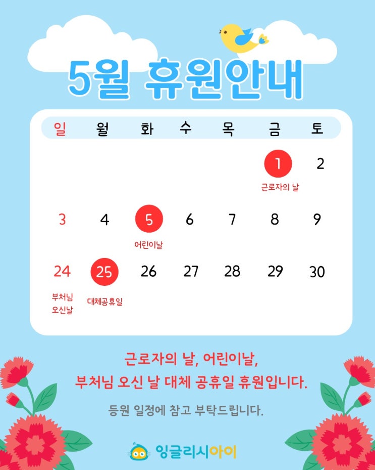 잉글리시아이 그린점 5월 휴원 안내입니다.