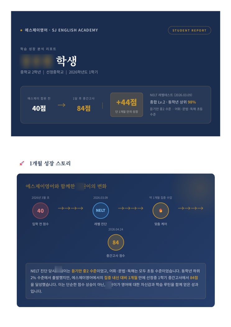 안녕하세요? 은평구 녹번동 초중등 전문 에스제이 영어입니다. 중고등 중간/ 기말고사 시즌에는 참 많은 숫자가 오갑니다. 40점에서 84점. 한 달 만에 44점이 뛰어오른 이 드라마틱한 숫자 앞에서, 저는 점수 그 이상의 변화를 봅니다. 오늘은 태어나서 학원이라는 곳을 이번에 처음 시작한, 한 선정중학교 2학년 학생의 이야기를 들려드리려 합니다. 선생님이 학생 목이라도 잡고 흔들었나요? 한 달 만에 점수가 두 배 이상 껑충 뛴 성적표를 보시고, 주변에서는 농담처럼 묻기도 하십니다. "도대체 어떻게 가르쳤길래 한 달 만에 점수가 저렇게 나오냐"면서요. ^^ 네, 맞습니다. 저는 이 아이를 잡고 흔들었습니다. 하지만 제가 흔든....... <img src="https://blogthumb.pstatic.net/MjAyNjA0MjlfNTMg/MDAxNzc3MzkxNTA3OTYx.aqaCdJpCEPdBL1SUtCc6YS_V1F-zFbimP7d7-8LtaQYg.ggMVN2yUnhY4ao51W2tkX_eKjKsM7LsZ9co0c-YNFnAg.JPEG/%B0%AD%B7%CE%BF%F8_%C7%D0%BD%C0_%BA%D0%BC%AE_%B8%AE%C6%F7%C6%AE___%BF%A1%BD%BA%C1%A6%C0%CC%BF%B5%BE%EE_page-0001.jpg?type=s3" />