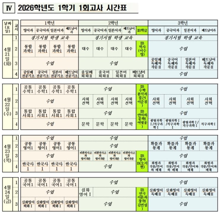 26년 1학기 중간고사 시간표가 발표되고 어느덧 시험도 마무리 되어 가고 있습니다. 예전에는 학년별 시험 날짜가 상이했는데요 이번에는 1학년부터 3학년까지 모두 화요일 첫 날 하루에 집중되어 진행되었습니다. 아직 결과는 나오지 않았지만 모두 열심히 준비해 주었고요. 실수가 있었다면 그건 다음 시험을 위한 경험치라고 생각합니다. 모두 모두 고생 많았어요. 혹시 열심히 공부하고 싶은데 학습 방법을 모르던가, 정보면에서 부족하다면 연락 주세요. 함께 열심히 준비해요~~ ^^ 준비물: 본인의 의지는 필수로 가지고 오셔야 합니다. ( 그럼 저는 얼마든지 도와 드릴 수 있습니다~`^^ ) 경희실용중국어 <경희실용중국어 인스타그....... <img src="https://blogthumb.pstatic.net/MjAyNjA0MjNfNzkg/MDAxNzc2OTEzODY4MzI5.8qrXkwF3R0ubcbk5c-snvRytCKVvC_1YVBhzJHb5Mn4g._-zzpAcq4vClb1p7h60clxNjPz5dWVtGHTD-ho5lyEYg.JPEG/%BF%DC%B0%ED_%BD%C3%B0%A3%C7%A5.jpg?type=s3" />