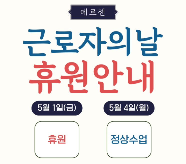 안녕하세요 메르센 수학입니다 :) 5월 1일은 휴원 , 5월 4일에는 정상 수업이 진행됨을 안내드립니다. 일정에 착오 없으시길 바랍니다. 기타 문의사항이 있으시다면, 02) 423-1209 연락 주시길 바랍니다! <img src="https://blogthumb.pstatic.net/MjAyNjA0MjFfMTk1/MDAxNzc2NzQyOTM0NTU4.TXvZqD_-0RzohhRwXi2vweYV9teoLTB_k_J_cYeEptcg.EVNIyykdAvlVEy7VJjhpgxC-choy26GJf-vLfz3PFakg.PNG/900_1776742585185.png?type=s3" />