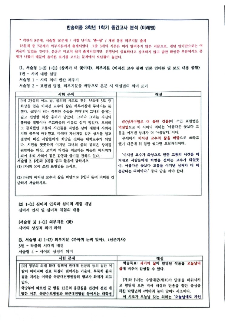 #슬기로운공부방 #반송여중 #기출유형 #중3 #창원국어학원 이번 반송여중 3학년 기출에는 눈에 띄는 점이 있습니다. 교과 내용과 교과 외 지문을 연계해서 학생 스스로의 능동적 학습 과정을 확인하는 유형이 출제되었습니다. 단순한 내용 암기보다는 교과 지식을 생활 속 지문에서 적용할 수 있는가, 하는 문제입니다. 학생들은 다소 어려워했을 수 있으나 암기로만 접근하는 학습법의 한계를 지양했다는 점에서 좋은 문항이었다고 생각합니다. 모든 과정의 교과 학습이 궁극적으로는 이런 유형을 지향해야 한다고 저른 생각합니다. (왼쪽) / (오른쪽) 시험 문제 해설-(파란색) 외부 지문 추출 정보 #슬기로운공부방 #반송여중 #기출유형 #중3 #....... <img src="https://blogthumb.pstatic.net/MjAyNjA0MjhfMjky/MDAxNzc3MzYxOTI0MzMz.rPzninOlVvsIBhA_OVN7hIzA5pnBY6xSPVEFGmiNe9Qg.8IhgDYlhsPqna2yHniaIlTxj8Mucx7iuidn_KEkbPKMg.JPEG/900_CamScanner_2026._04._28._16.28_1.jpg?type=s3" />