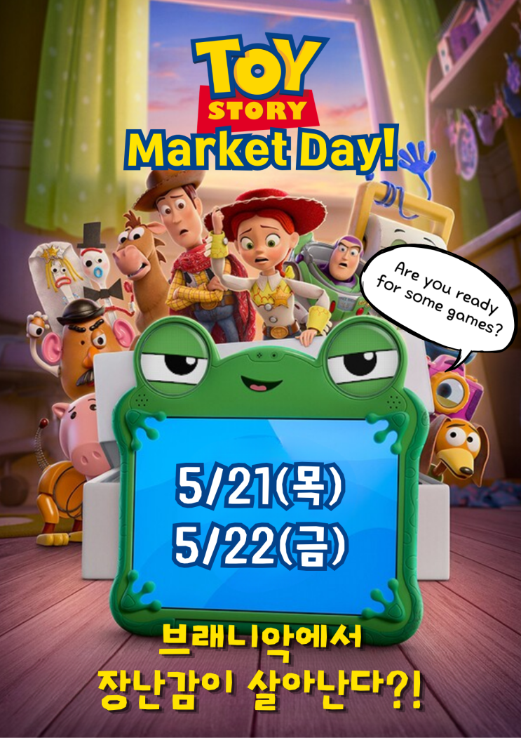 안녕하세요, 브래니악 영어학원입니다. 따뜻한 햇살이 가득한 5월, 우리 아이들이 손꼽아 기다려온 '브래니악 마켓데이' 소식을 전해드립니다! 위례의 우리 아이들과 첫 만남을 가진 게 엊그제 같은데, 벌써 아이들이 브래니악에 스며들어 즐겁게 공부하는 모습에 늘 감사한 마음입니다. 그 성원에 힘입어, 드디어 위례캠퍼스에서의 '첫 번째 마켓데이'가 개최됩니다! 이번 마켓데이는 아이들의 동심을 자극할 특별한 테마로 준비했는데요. 바로 <토이 스토리(Toy Story)> 세상이 브래니악에 펼쳐집니다! 교실 곳곳은 토이스토리 분위기로 꾸며지고, 무엇보다 이번 포스터에는 Toy Story 캐릭터들로 변신한 브래니악 선....... <img src="https://blogthumb.pstatic.net/MjAyNjA0MjdfMjY1/MDAxNzc3MjkxNDA2NzIw._3xb1oBTnKbzZRmBD3MSQhnZAg5P8IiXoD54QRdoHc0g.7v70CGDfpTtQoMOLkT2ASb-W1NU6lYZv5zcGtfcCO0kg.PNG/image.png?type=s3" />