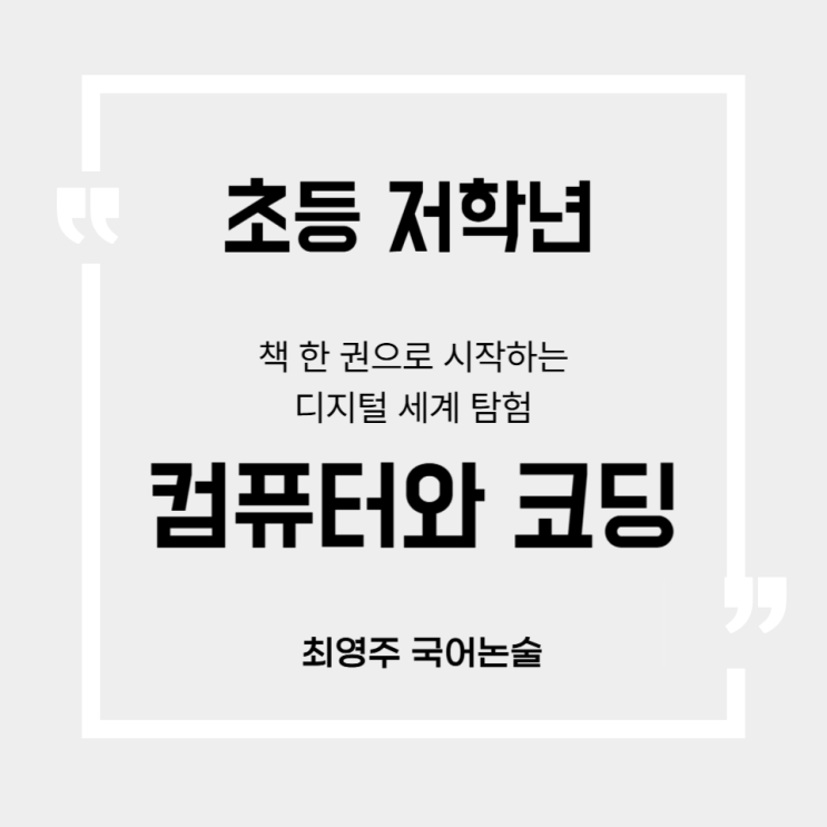 학습 목표 1 컴퓨터의 종류와 내부 구조, 작동 원리를 이해한다. 2 코딩과 프로그램의 개념을 파악하고 알고리즘의 의미를 설명할 수 있다. 3 컴퓨터가 정보를 저장하는 방식 (이진법, 픽셀, RGB)을 이해한다. 4 책을 읽고 핵심 내용을 자신의 언어로 정리하여 독후감으로 표현한다. 안녕하세요, 최영주 국어논술입니다. 오늘은 우리 학생이 《컴퓨터와 코딩》을 읽고 쓴 독후감을 소개합니다. 컴퓨터의 원리부터 코딩, 인터넷, 스크래치까지 어렵게 느껴졌던 디지털 세계를 이 책 한 권으로 차근차근 이해하게 된 과정을 학생의 언어로 담아냈습니다. 1. 이 책은 어떤 책인가요? 《컴퓨터와 코딩》은 어스본출판사의 어린이 과학 시리즈로, 컴퓨....... <img src="https://blogthumb.pstatic.net/MjAyNjA0MTVfMTYw/MDAxNzc2MjE0NzQxNjI2.avaumsMr6YepQmOIIEXC0YrQYrd4ogBoQIijiSrCYsYg.vVC4JqzlSXh5N0oLdbdhVOswFpEW_8gDJYdCacBneA4g.PNG/%BA%ED%B7%CE%B1%D7_%BD%E6%B3%D7%C0%CF-001_%2811%29.png?type=s3" />