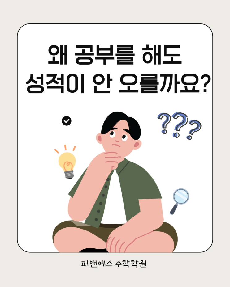 왜 공부를 해도 성적이 안 오를까요?✏️ 아이들이나 학부모님과 이야기를 하다보면 자주 듣는 이야기입니다. "하루에 몇 시간씩 공부하는데 그대로에요...." "책상에는 오래 앉아 있는데 결과가 안 나와요..." 이럴 때 많은 분들이 "공부 시간이 부족한가?"라고 생각합니다. 하지만 대부분의 경우 문제는 반대입니다. ⭐시간은 충분한데, '집중력'이 부족합니다.⭐ 왜 오래 공부해도 성적이 안오를까?✏️ 많은 학생들이 이렇게 공부합니다. 문제 몇 개 풀다가, 핸드폰 보고 , 딴 생각하고, 다시 문제 풀고.... 많은 학생 분들이 공감하실 수도 있지만 이건 공부가 아니라 시간 보내기입니다. 겉으로 보....... <img src="https://blogthumb.pstatic.net/MjAyNjA0MzBfMTkx/MDAxNzc3NTQwNjIzOTc1.DTkWLNOUTfD1d5KAuDK369EVwbKM6CymytFinyrqC7gg.tuEJ68TO883zFheajXcsd8NB7XGySjkekBlEPi6x2wwg.PNG/%BA%A3%C0%CC%C1%F6%BB%F6_%B0%CB%C1%A4%BB%F6_%BD%C9%C7%C3%C7%D1_%C5%A9%B8%AE%BF%A1%C0%CC%C5%CD_%C6%AF%B0%AD_%B0%F8%C1%F6_%C0%CE%BD%BA%C5%B8%B1%D7%B7%A5_%B0%D4%BD%C3%B9%B0.png?type=s3" />