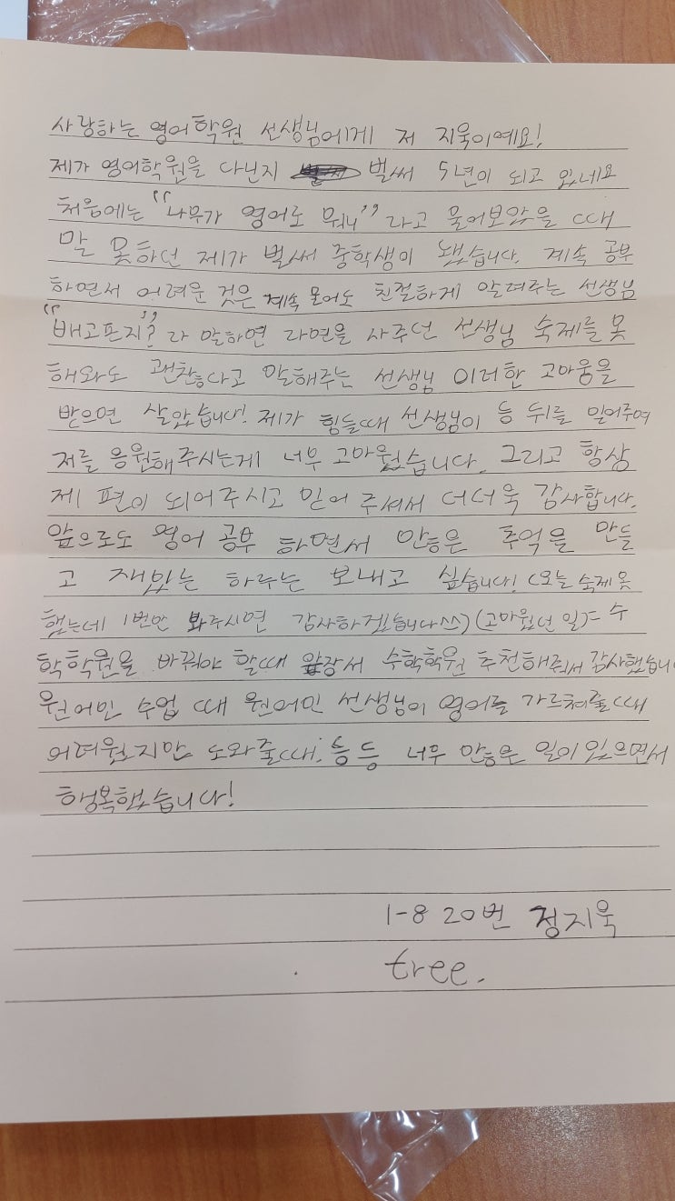 영어는 얼마나 오래 했느냐보다 얼마나 제대로 배우고 있느냐가 더 중요합니다. 오늘은 1학년 기초레벨반 한 학생의 글을 통해 그 차이를 직접 보여드리려고 합니다. 처음 작성한 글입니다. 짧은 문장 위주로 ✔ 단순한 표현 ✔ 문장 연결의 부족 ✔ 생각을 길게 풀어내기 어려운 상태였습니다. 많은 아이들이 이 단계에 머물러 있습니다. 문장을 “아는 것”과 글을 “쓰는 것”은 완전히 다르기 때문입니다. 몇달 이후 작성한 글을 보면 확연한 차이를 확인할 수 있습니다. ✔ 문장의 길이가 길어지고 ✔ 생각이 자연스럽게 이어지며 ✔ 하나의 이야기로 완성됩니다 단순한 문장이 아니라 자신의 생각을 영어로 표현하는 글이 됩니다. 이....... <img src="https://blogthumb.pstatic.net/MjAyNjA0MjlfNDYg/MDAxNzc3NDU2NzIwNDQ2.GT7bEI2iwR7uhG6L0h1RZlWm5q8RzaLOQxIqTRPN0E8g.wtx63WRy6ksifxTzR5GE-ED2rU8BJgJZrR5zwYUBFFcg.JPEG/1b-first.jpg?type=s3" />