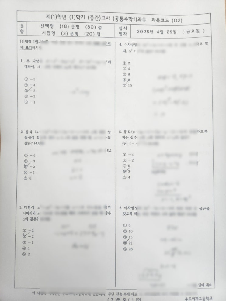 안녕하세요. 동작구 대방동 신대방삼거리에 위치한 사피엔스 수학학원입니다. 수도여고 2025학년도 중간시험에 해당하는 공통수학 1 기출문제 및 자세한 모범답안을 가지고 사피엔스 수학학원은 수업을 진행하고 있답니다. (참고) 2026학년도의 공통수학 1학년 1학기 중간시험범위는, 작년 2025학년도 시험범위와는 달라서 몇 문제는 안 풀고, 기말시험을 위해 남겨두어도 좋습니다. 매시간 꼼꼼하게 테스트를 보고, 질문하면서, 개념 설명도 들을 수 있는 사피엔스 학원은 금요일 클리닉수업과 토요일 특별수업도 진행하고 있습니다 쉬는 시간도 허투루 버리지 않고 공부하는 진짜 실력자들이 함께하는 공간으로 초대합니다. 제대로 공부할 의지....... <img src="https://blogthumb.pstatic.net/MjAyNjA0MThfMjE2/MDAxNzc2NTEwMjg0NzIx.T828CTnQy-dj-dXnbLxqs0t7efths-1vexjmbeRoJOsg.dv7GHePIGBPfO_khYvCTaqTchoIT1EdGeVErTmYK4Z0g.JPEG/900_1776509917678.jpg?type=s3" />