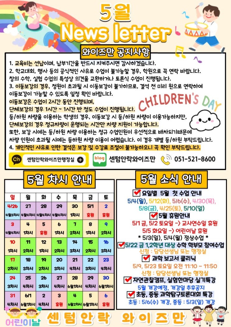 안녕하세요 센텀안락 와이즈만입니다:) 오늘은 5월 소식지를 들고 찾아뵙게 되었습니다^^ 그럼 바로 저희 센텀안락 와이즈만의 5월 소식, 알려드릴게요 첫번째 소식은 5월의 첫 수업 안내입니다! 5/4(월), 5/12(화), 5/6(수), 4/30(목), 5/8(금), 4/25(토), 5/10(일) 이 1차시 수업으로, 각 요일마다 첫 수업을 시작하는 날짜가 달라 차시가 헷갈릴 수 있으니 아래의 소식지를 참고 부탁드립니다:) 두번째 소식은 5월의 휴원 안내입니다! 5/1 금요일, 5/2 토요일은 교사연수일로 인해 휴원, 5/5 화요일은 어린이날 휴원입니다! 화, 금, 토에 수업이 있는 학생들은 5/1(금), 5/2(토), 5/5(화)에 수업이 없으며, 그때 못한 수업은 그 다음주에....... <img src="https://blogthumb.pstatic.net/MjAyNjA0MTZfMTU2/MDAxNzc2MzI5NTMwNDYz.3VNXXycvvTPE-dB0OiQNTbzqNfV-IU-XfXXmD9nTMpwg.47NGa5PbFlaOaOScEAWrx22RaUeNHXoVfw222FtdB9Ag.JPEG/5%BF%F9_%B1%B3%C0%B0%C1%F6%BF%F8%BA%CE_%BC%D2%BD%C4%C1%F6.jpg?type=s3" />