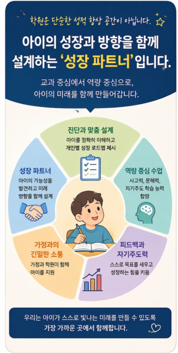 AI시대에서의 역량 중심 교육에서 라임에듀학원의 역할은 무엇일까요? 단순한 ‘문제풀이 공간’을 넘어 ‘아이의 성장 설계자’로 확장됩니다. 먼저, 아이의 현재 수준과 학습 습관, 정서 상태를 정확히 진단하고 개인별 맞춤 로드맵을 제시해야 합니다. 둘째, 교과 지식을 가르치는 데 그치지 않고 사고력·문해력·자기주도 학습 능력을 함께 길러주는 수업이 중요합니다. 셋째, 꾸준한 피드백을 통해 아이가 스스로 목표를 세우고 조정하는 힘을 키워야 합니다. 또한, 부모와의 긴밀한 소통을 통해 가정과 학원이 같은 방향으로 아이를 지원하는 구조를 만드는 것이 필요합니다. 결국 라임에듀학원는 성적을 올리는 곳을 넘어, 아이가 자신의 가....... <img src="https://blogthumb.pstatic.net/MjAyNjA0MjNfODIg/MDAxNzc2OTA5Mjk3MTgy.8jHbYG0-R52R0dMFYzkz0twPA3SoP-zgwvyDLvS93Rwg.F0lS7R3cLHBcMXD3Ze9YFaeZpgIfy4qCwnhapeyhu2og.JPEG/900_1776908680197.jpg?type=s3" />