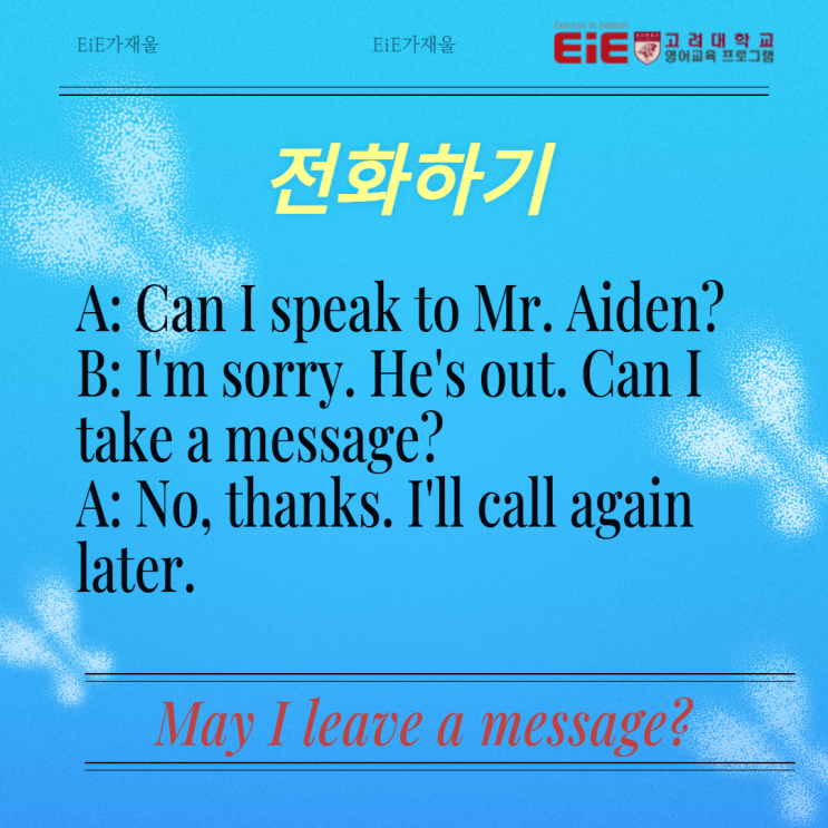 북가좌동 영어학원 EiE고려대 국제어학원 서대문가재울 캠퍼스입니다!! 이제 따뜻한 봄이네요~ 주위의 예쁜 장소도 많이 방문하시고, 행복한 추억들을 간직하세요~ 오늘은 [전화하기]의 표현을 배워볼게요.^^ 전화를 걸어 통화할 사람을 찾을 때는 'Can I talk/speak to....?' 라고 말할 수 있습니다. 이에 대한 대답으로 본인이 당사자라고 밝힐 때는 'Speaking.'이라고 말하며, 전화를 건 사람이 누구인지 물을 때는 'Who's calling, please?'라고 말할 수 있습니다. ** Expressions Plus1 Sherlock: May I speak to Sunny? (Sunny 와 통화할 수 있을까요?) Sunny: This is she. Who's this? (전데요....... <img src="https://blogthumb.pstatic.net/MjAyNjA0MTBfMTM3/MDAxNzc1ODEzNDE0MDAz.r0BVgfTp-WV8l4RBZfubWqCZQhhnFEjRCvhzsCmrg0kg.3cJxVUoUHSTUsgANJPWUFrQZ-AvOolhu832bu15ijTcg.PNG/%C1%A6%B8%F1%C0%BB_%C0%D4%B7%C2%C7%CF%BC%BC%BF%E4.png?type=s3" />