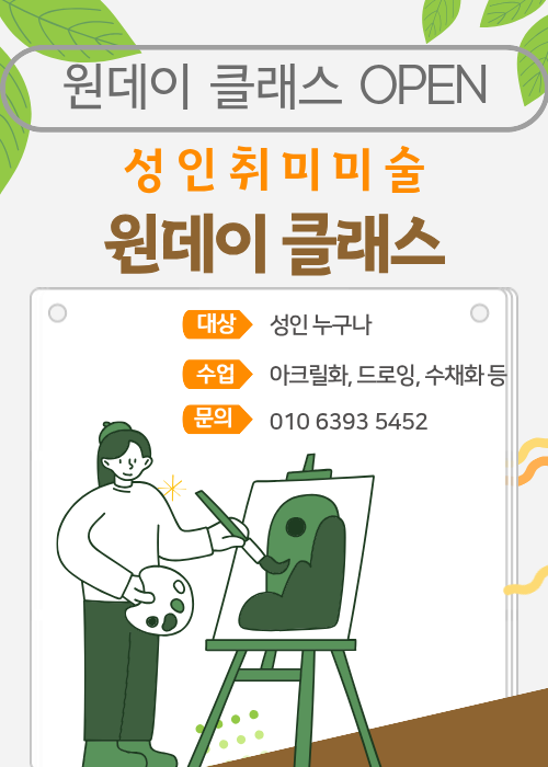 서대문 예중예고입시미술학원 위드아트미술학원 예중입시 예고입시 미대입시 초등미술, 성인 취미미술 원데이 클래스 수업대상; 성인 누구나 수업시간; 1시간50분 수업, 화수목금2시-5시 시작 가능 수업과목; 5호 캔버스 아크릴화(재료비 3000원), 수채화, 소묘, 색연필화, 드로잉 등 수 강 료; 최초 등록 2회까지 1인30,000원, 2인 그룹50,000원 *이후 재등록시 1인 50,000원 2인 그룹 90,000원 #위드아트미술학원 #위드아트스튜디오 #연합시험 #합격 #서울예고 #선화예고 #서울미고 #예고시험 #위드아트 #미술학원 #초등미술 #성인미술 #예중예고입시 #아동미술 #서대문 #홍제동 #서울안산초 #고은초 #취미미술 #드로잉 #일러스트 #아크릴칼라....... <img src="https://blogthumb.pstatic.net/MjAyNjA0MjlfMjky/MDAxNzc3NDQ5MjEzMTA0.FPVrFNYXpT5CzV66C-XxJMQhfu-WkrBlXyuaVBzwpLog.t1xaUuKwyeMQQR6qStOS-ohhJfDQdR_6ViyT-nKOjYgg.PNG/%C1%A6%B8%F1%C0%BB_%C0%D4%B7%C2%C7%D8%C1%D6%BC%BC%BF%E4._%282%29.png?type=s3" />