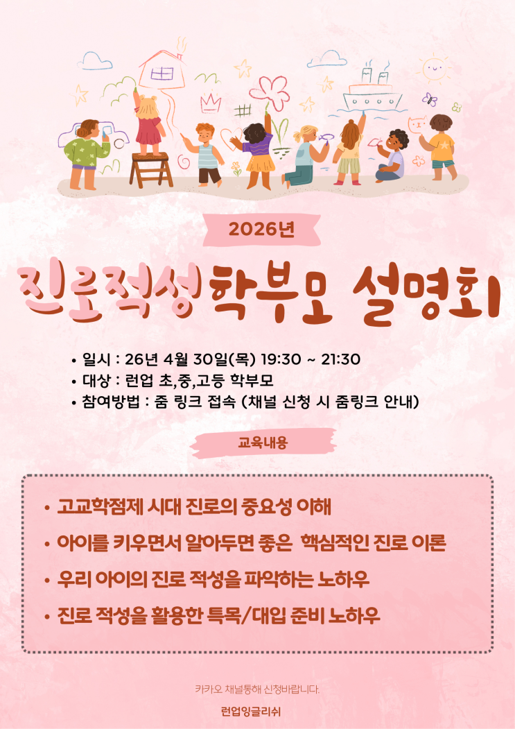 안녕하세요 . 런업 잉글리쉬 입니다 학부모라면 항상 하는 고민이죠 “우리 아이, 뭘 잘하는지 모르겠어요” “공부는 하는데 방향이 맞는지 걱정이에요” 사실 많은 학생들이 자신의 적성과 방향을 모른 채 공부만 하고 있는 경우가 많습니다. 그래서 이번에 학부모님들을 위한 특별한 시간을 준비했습니다. [진로.적성 학부모 설명회] ▀ 주제 : 알다가도 모르겠는 우리아이! 진로 적성은 어떻게 알 수 있을까 ? ▀ 일시 : 2026년 4월 30일(목) 19:30~21:30 ▀ 대상 : 런업 초·중·고등 학부모 ▀ 주요 내용 - 고교학점제 시대에서 진로의 중요성 이해하기 - 아이를 키우면서 알아두면 좋은 핵심적인 진로 이론 - 우리 아이의 진로 적....... <img src="https://blogthumb.pstatic.net/MjAyNjA0MjBfMTQ4/MDAxNzc2NjcyODk5ODU0.2Db3aOrJhAahCDdmQG15dpdh3I-e67KVAQk3ngi_0vcg.kGJcGgh-I2neLCH2MQL-L5u9Zc7w6YSt0bTu3lXNYUog.PNG/4%BF%F9_%C7%D0%BA%CE%B8%F0_%BC%B3%B8%ED%C8%B8.png?type=s3" />