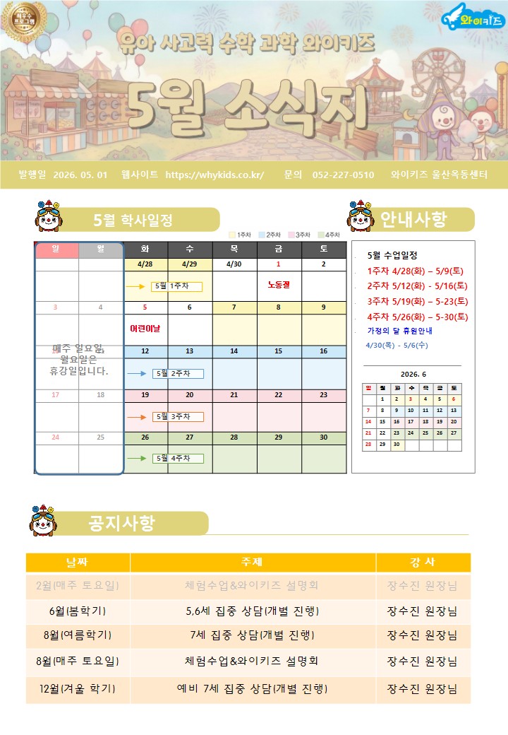어느덧 따스한 햇살이 눈부신 5월이 찾아왔습니다. 지난 4월, 아이들의 반짝이는 상상력으로 가득했던 제4회 창의력 그리기대회에 보내주신 뜨거운 성원과 관심에 깊은 감사를 드립니다. 4/30(목) - 5/6(수)은 가정의 달 휴원입니다. 가족들과 함께 즐거운 연휴되세요~^^ <img src="https://blogthumb.pstatic.net/MjAyNjA0MjJfMTE4/MDAxNzc2ODQ5NTUzNDY2.DTJH3J0i477ZDQzY9Byki-yfUXptUlQazB4qFC8MU3gg.WpeNJlmutbDJZO7dj-l59egwDaUfQK9ytv2c48cHcmsg.JPEG/%BD%BD%B6%F3%C0%CC%B5%E50001.jpg?type=s3" />