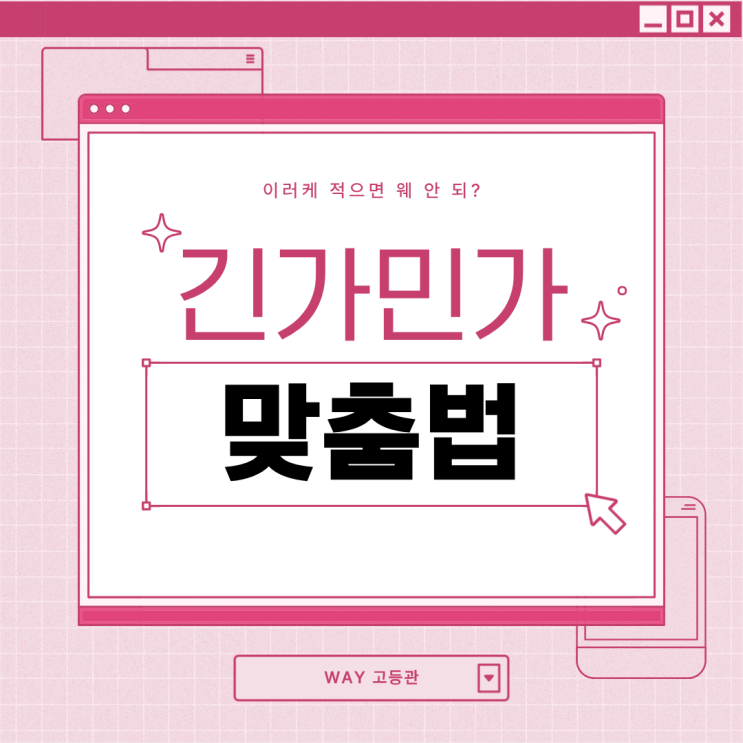 안녕하세요~ WAY 고등관입니다! 긴가민가~ 이건가 저건가~ 하고 고민하다가 한 번쯤은 검색해 봤던 바로 그 맞춤법들! WAY가 정확하게 알려드립니다! 그럼 시작해 볼까요~? 스크롤을 내리면서 정답을 골라보세요! 자주 쓰는 단어죠! ㅔ와 ㅐ가 헷갈리는 단어가 참 많은 것 같은데요ㅎㅎ 과연 정답은~~? '요새'가 맞습니다! '요사이'의 준말이라는 것을 기억해 두면 헷갈리지 않을 거예요~ 지난번에 포스팅했었던 '금세'를 기억하시나요? 이 단어 또한 '금시에'의 줄임말이었죠! 그래서 정리하자면 요사이 = 요새 금시에 = 금세 이므로 요세, 금새는 사용하지 않기~! 눈에 띠다, 눈에 띄다 발....... <img src="https://blogthumb.pstatic.net/MjAyNjA0MjFfMjEy/MDAxNzc2NzUwODQzNDk2.qFuEqTjp1r02X0_DapEOnVceuaG9pvdIPlIGeRkpbMEg.K1PFfAJHKERHM_iMK8SmBTx6s_bjEBL7TQTh9nFdSBUg.PNG/%C1%A6%B8%F1%C0%BB_%C0%D4%B7%C2%C7%D8%C1%D6%BC%BC%BF%E4._%282%29.png?type=s3" />