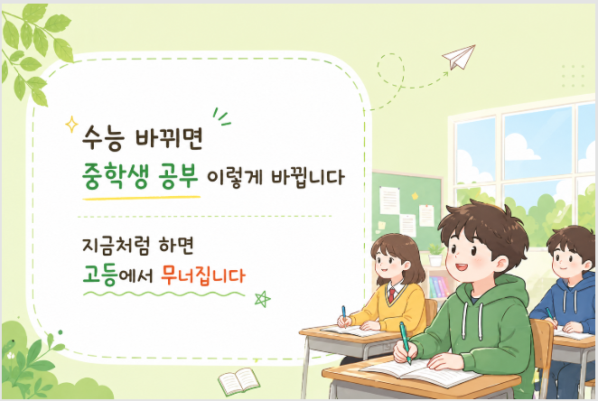 수능 절대평가 되면 중학생 공부는 이렇게 바뀝니다. (지금 방식으론 위험합니다) 수능이 바뀐다는 이야기가 나오고 있습니다. 이 변화는 고등학교가 아니라, 이미 중학교 공부부터 영향을 줍니다. 그렇다면 지금, 중학생 공부는 어떻게 바꿔야 할까요? 1. “지금처럼 공부하면, 고등에서 무너집니다” 요즘 학부모 상담에서 가장 많이 듣는 말입니다. “수능 바뀐다는데… 지금 공부 계속 시켜도 되나요?” 결론부터 말씀드리면, ✔ 지금 방식 그대로 가면 위험합니다 왜냐하면 교육제도보다 먼저 바뀌고 있는 것이 하나 있기 때문입니다. ✔ ‘문제를 푸는 시험’ → ‘이해를 확인하는 시험’으로 바뀌고 있습니다. 2. 사실, 제도보다 더 중요....... <img src="https://blogthumb.pstatic.net/MjAyNjA0MjVfMTU5/MDAxNzc3MDkwODk2NjY5.ShwldiW9MA9-fD5b-aPautFuUPbPSVXLpbto4oC_KZ8g.LuO9w7q5jZ2VQx97ie8XaJ5cD4F_fXLys_tLUK7EuQUg.PNG/image.png?type=s3" />