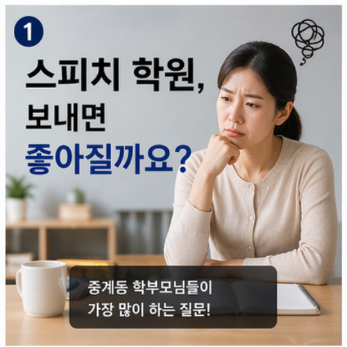 “스피치 학원을 보내면 좋아질까요?” 중계동에서 상담을 하다 보면 정말 많이 듣는 질문입니다. 그런데 이 질문, 겉으로는 같지만 그 안에 담긴 고민은 모두 다릅니다. ✔ 발표만 하면 얼어붙는 아이 ✔ 또래관계에서 위축되어 자기표현이 어려운 아이 ✔ 논리적으로 말하지 못해 설명이 안 되는 아이 ✔ 면접만 가면 긴장해서 말이 멈추는 아이 이처럼 다양한 이유로 중계스피치, 중계스피치학원을 찾게 됩니다. 겉으로는 모두 “말하기 문제”처럼 보이지만 실제 원인은 전혀 다릅니다. 그래서 많은 부모님들이 스피치학원이 정말 도움이 될지 고민하게 됩니다. 결론부터 말씀드리면 스피치학원을 다니면 분명 바뀝니다. 하지만 중요한 전제....... <img src="https://blogthumb.pstatic.net/MjAyNjA0MjVfMjcg/MDAxNzc3MDgxNTY0NTgz.GJqGZcP5WlHpBn1dzs4Q1H_kG2HVgJH5c9y83_lvyzog.Sll2iDMYNR2wrEDGf4BmRI0LCHYZPmqXI3vGjRJ0TTMg.PNG/%C5%B0%C1%EE%BD%BA%C7%C7%C4%A1%C7%D0%BF%F8_%C1%DF%B0%E8%BD%BA%C7%C7%C4%A1_01.png?type=s3" />