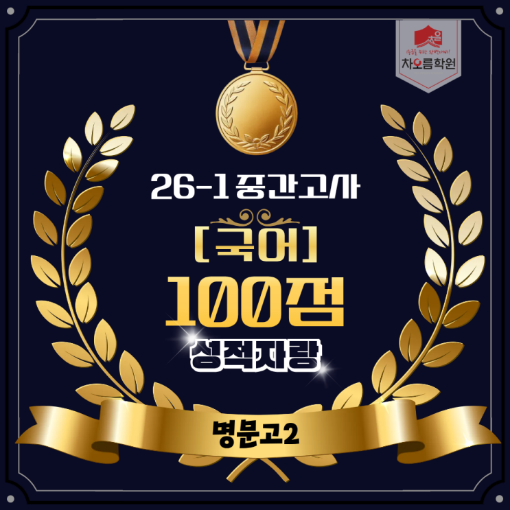 안녕하세요! 차오름학원입니다❤️ 오늘은 기분 좋은 소식을 전해드리고자 합니다! 바로 명문고등학교 2학년 중간고사에서 우리 오름이들이 좋은 성과를 거두었다는 소식입니다✨ 100점: 23명 예상 90점: 이상 24명 예상 이번 중간고사에서 명문고등학교 2학년 오름이들 중 국어과목 100점을 받은 오름이들이 "23"명이며 또한 90점 이상의 오름이들 또한 "24"명이 예상 됩니다 (현재까지 집계된 성적 기준) 오름이들, 올해 첫 중간고사라 많이 긴장되었을 텐데 끝까지 포기하지 않고 최선을 다해준 모습이 정말 인상 깊었습니다. 그 결과 이렇게 좋은 성과로 이어진 점, 진심으로 축하하고 자랑스럽습니다 평소 수업 시....... <img src="https://blogthumb.pstatic.net/MjAyNjA0MjVfOTgg/MDAxNzc3MTA3MjcyNjM5.Kr_DgasZ-MoOV_vmzJ3SvEPolY71k_O-v7MrFTOp38Ig.h1hwA4J7bsOupzZ4X4gYkknY3W8ywy4q6iL2-Cw1FCcg.PNG/1.png?type=s3" />