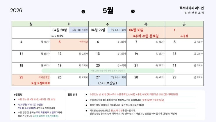 안녕하세요, 리드인 삼송신원초점입니다. 아이들이 책장을 넘기는 소리가 유난히 싱그럽게 들리는 5월입니다. 빨간 날이 많아 자칫 흐트러지기 쉬운 달이지만 아이들의 독서 호흡을 세심하게 챙기며 한 달을 꽉 채우겠습니다. 5월은 공휴일이 많아 수업 회차 조정을 위해 4월 말부터 5월 수업이 미리 시작됩니다. 일정이 다소 복잡할 수 있으니 아래 내용을 꼭 확인해 주시기 바랍니다. 5월 수업 일정 수업 없는 날 (휴원): 4/30(목): 4월 4주차 수업 종료일 5/1(금): 근로자의 날 5/5(화): 어린이날 5/25(월): 대체공휴일 5월 수업 시작일 안내: 화요반: 4/28(화)에 5월 1회차 수업을 미리 시작합니다. 수요반: 4/29(수)에 5월 1회차 수업....... <img src="https://blogthumb.pstatic.net/MjAyNjA0MjBfNTIg/MDAxNzc2NjcwMjA0NTYw.NKmT2xKAfSGdE8PzfglCtouy0HMDCjmS6dy67K4wjmsg.R2cjpjnGssJTpht6hK7mlucyZoCHd3qLXaeQ88nRzWQg.JPEG/2026_%B8%AE%B5%E5%C0%CE_%BC%F6%B0%AD%C0%CF%C1%A4.jpg?type=s3" />