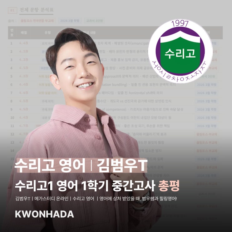 안녕하세요. 권하다 프리미엄관입니다. 이번 2026학년도 수리고1 1학기 중간고사가 마무리되자마자, 수리고 영어 전문가 김범우T가 누구보다 빠르게 시험지 분석을 해주셨습니다. 2026년 수리고1 영어 1학기 중간고사 총평 시험범위: 공통영어1 YBM김 3단원 / 올포연 14지문 / 2026 3월학평16지문 [수리고1 영어] 1학기 중간고사 출제 경향 및 특징 분석 안녕하세요! 수리고 영어 범우T입니다. 이번 중간고사는 변별력을 확보하기 위한 학교 측의 고민이 고스란히 느껴지는 시험이었습니다. 우리 아이들이 왜 어렵게 느꼈는지, 앞으로 어떻게 대비해야 할지 3가지 핵심 포인트로 짚어드립니다. POINT 1. 어휘와 어법 비중 38%, '한 끗 차이....... <img src="https://blogthumb.pstatic.net/MjAyNjA0MjNfMjYy/MDAxNzc2OTE4MTQyNTIz.C8XRojooOMH-5wq8eQcWvadlo2Rj-n_TiCll9VlFRM0g.YzRz9laESRSZblTTlSw3kn5Fz0GSv3P4zPQ1-r8tpbQg.JPEG/%BC%F6%B8%AE%B0%ED_%BF%B5%BE%EE_%B3%BB%BD%C5%BA%D0%BC%AE.jpg?type=s3" />