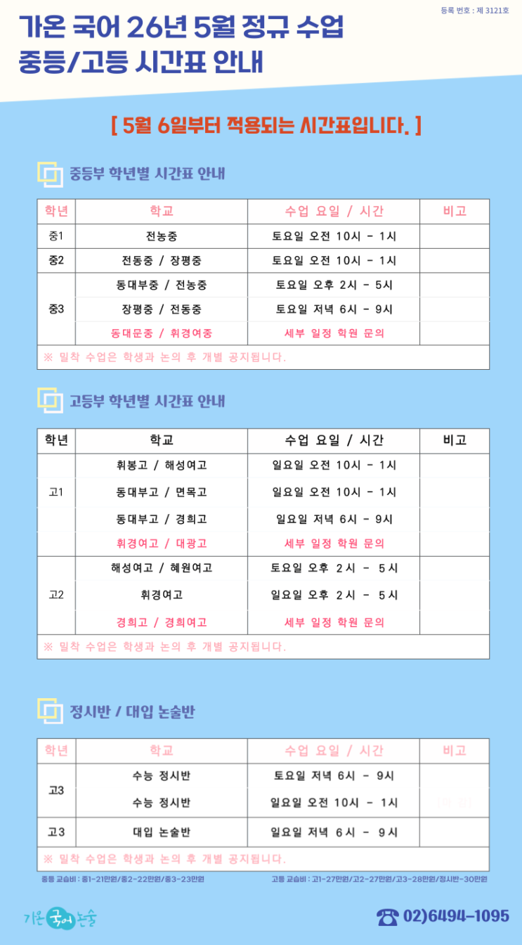 어느 덧 봄볕이 무르익어 꽃비가 날리고 푸른 새싹이 피어오르네요 짧은 봄이 가고 금세 더위가 올 걸 생각하니 오늘 봄 하루가 무척 아쉽습니다 4-5월 수업 안내드립니다 4월 5주차 휴업일은 29일 수요일과 30일 목요일입니다 다음 날인 5월 1일 금요일은 노동절 휴일로 지정되어 이어서 쉬게 되었습니다 5월 4일 월요일은 많은 학교가 재량 휴업일로 지정하였으나 정상수업 진행 예정입니다 다만 수업 시간은 조정하겠습니다 그리고 이 날 5월 5일(화)과 25일(월)분 결손 수업도 보강할 예정입니다 수업은 위의 표에서 보시고 A~D에서 선택하시어 답신 주시면 됩니다 월요일에 원래 등원하는 학생들의 경우 2타임씩 수업할 예정입니다 5/5 어린....... <img src="https://blogthumb.pstatic.net/MjAyNjA0MTVfMjMx/MDAxNzc2MjM3MTU5NzU0.6IVl8kD-BC4lXiEawMzw779s76irFsgfbgkMPMo4bp0g.P_a0Q0tYG_yEm8X9u5HWrvzr3JO1ueRmo6IRpN8Ps1Ag.JPEG/4-5%BF%F9.jpg?type=s3" />