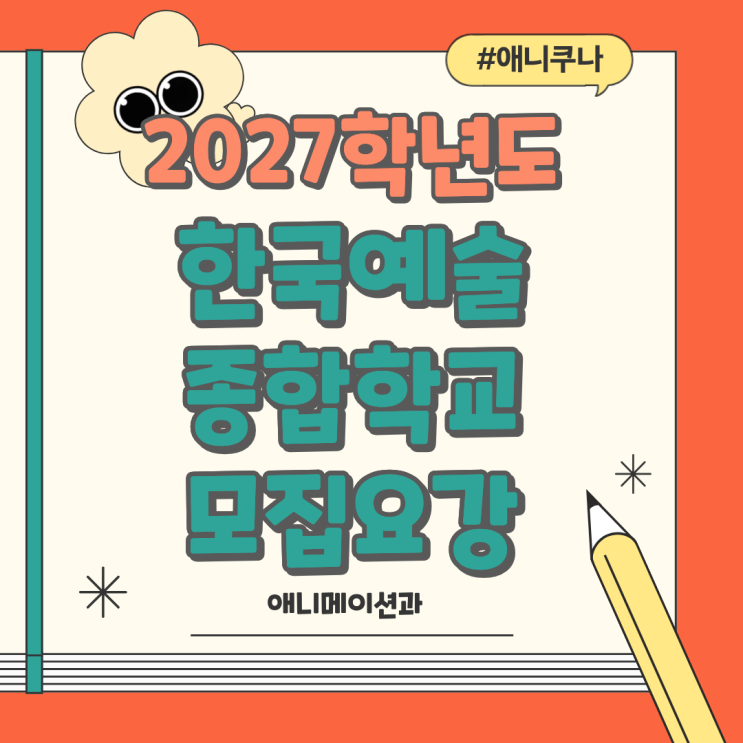 안녕하세요 여러분? 홍대 애니쿠나만화학원입니다~ 여러분은 공포영화를 좋아하시나요? 쿠나쌤은 저번주에 살목지를 보고 왔는데요~ 정말 정신이 아득해지는 시간이었습니다.. 공포영화를 영화관에서 보면 귀신이 나타날 걸 예상하다가도 큰 사운드 때문에 어쩔 수 없이 깜짝깜짝 놀라게 되는 게 있죠! 영화관은 또 그게 묘미인 것 같습니다. 여러분도 이번 여름엔 영화관에서 공포영화 한 편 어떠신가요? 오늘 알아볼 내용은 2027학년도 한국예술종합학교 애니메이션과 모집요강 안내 입니다~! 이번 년도 한예종 입시의 가장 큰 변경점은 아무래도 일반전형 2차와 정원외 전형 1차에서 포트폴리오 폐지가 되었다는 점이겠죠! 이외에도 어떤 변경....... <img src="https://blogthumb.pstatic.net/MjAyNjA0MjNfMjA4/MDAxNzc2OTQ4ODA4ODcw.KtSbSbmwSqw08o2olUsboAqjx8AepXvkS5em0BY3hWgg.F8et4T1uamrEjGuxN--EH1QIGDECgaLaQCiQFSQRyycg.PNG/%C7%D1%BF%B9%C1%BE1.png?type=s3" />