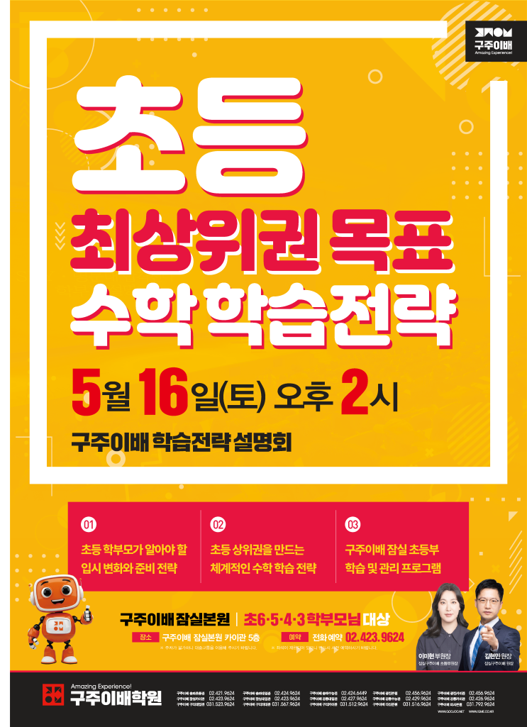 "초등, 결과를 바꾸는 결정적 시기입니다!" 구주이배 초등 수학 학습전략 설명회 대상 : 초 6·5·4·3 학부모님 대상 일시: 5월 16일(토) 오후 2시 ※ 좌석 제한으로 예약하신 학부모님만 입장 가능하니 반드시 예약 후 참석 부탁드립니다. 설명회 주제 ① 초등 학부모가 알아야 할 입시 변화와 준비 전략 ② 초등 상위권을 만드는 체계적인 수학 학습 전략 ③ 구주이배 잠실 초등부 학습 및 관리 프로그램 설명회 연사 [1부] 김현민 잠실구주이배 원장 [2부] 이미현 잠실구주이배 초등부원장 예약방법 ① 홈페이지 예약 ② 전화 예약 : 02-423-9624 장소 : 구주이배 잠실 카이관 (삼전로 100, 아카데미빌....... <img src="https://blogthumb.pstatic.net/MjAyNjA0MjdfMjE1/MDAxNzc3Mjg4ODg4NTk4.QhMCrx7HucoKlZ4vT41Q7zSu_6Q3NrHW5dC1xT7PSdQg.fxn9RkfkF6cKaD4ZfYssZp-zYxLhnUfL9fh71YZdOqAg.PNG/260516_%C3%CA%B5%EE%BC%B3%B8%ED%C8%B8_%C6%F7%BD%BA%C5%CD.png?type=s3" />