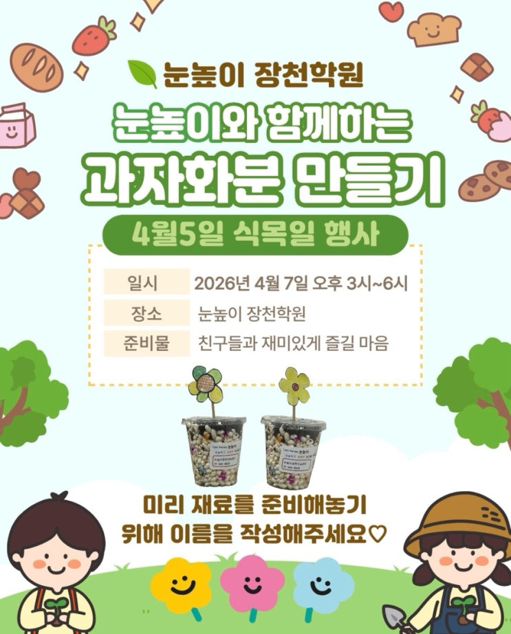 안녕하세요~ 눈높이 장천학원입니다! 4월을 맞아 친구들과 함께 식목일 기념 특별 활동을 진행했어요! 이번 활동은 바로 과자 화분 만들기 아이들이 직접 컵에 과자를 담고 예쁜 꽃 장식까지 꽂아 완성한 나만의 화분~~~! 완성 후 너무 뿌듯해하고 서로 자랑하느라 바빴답니다 이번 활동은 단순한 만들기가 아니라 식목일의 의미도 함께 이야기 나누는 시간이었답니다^^~~ “나무를 심는 날”을 넘어 자연을 아끼고 소중히 여기는 마음까지 아이들이 자연스럽게 배울 수 있었어요ㅎㅎ ⸻ 공부도, 즐거움도 함께하는 공간 눈높이 장천학원은 단순히 공부만 하는 공간이 아니라 배움의 즐거움 다양한 체험 아....... <img src="https://blogthumb.pstatic.net/MjAyNjA0MjJfOTEg/MDAxNzc2ODM2ODU1NDEz.54DzD7K8gtaVBDgElIGE9vubIpxqC0lzHGNqiym7fkIg.AmJQ8jImeYtmi_2ywIDlGtBb-kpqpN-8xxpib7DcCvQg.JPEG/IMG%A3%DF3003.JPG?type=s3" />